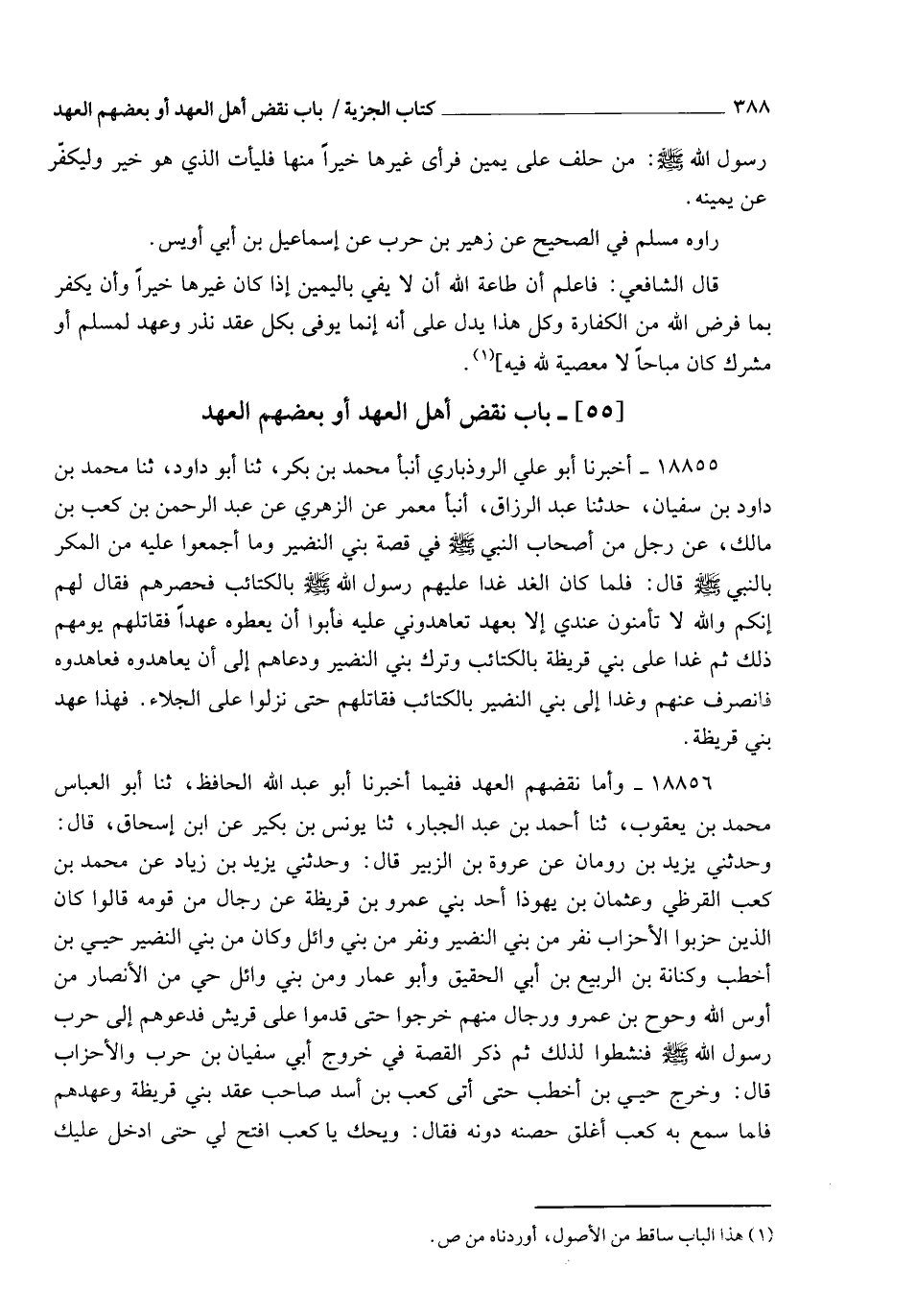 18855 - أَخْبَرَنَا أَبُو عَلِيٍّ الرُّوذْبَارِيُّ، أنبأ مُحَمَّدُ بْنُ بَكْرٍ، ثنا أَبُو دَاوُدَ، ثنا مُحَمَّدُ بْنُ دَاوُدَ بْنِ سُفْيَانَ، حَدَّثَنَا عَبْدُ الرَّزَّاقِ، أنبأ مَعْمَرٌ، عَنِ الزُّهْرِيِّ، عَنْ عَبْدِ الرَّحْمَنِ بْنِ كَعْبِ بْنِ مَالِكٍ، عَنْ رَجُلٍ مِنْ أَصْحَابِ النَّبِيِّ صَلَّى اللهُ عَلَيْهِ وَسَلَّمَ فِي قِصَّةِ بَنِي النَّضِيرِ وَمَا أَجْمَعُوا عَلَيْهِ مِنَ الْمَكْرِ بِالنَّبِيِّ صَلَّى اللهُ عَلَيْهِ وَسَلَّمَ قَالَ: فَلَمَّا كَانَ الْغَدُ غَدَا عَلَيْهِمْ رَسُولُ اللهِ صَلَّى اللهُ عَلَيْهِ وَسَلَّمَ بِالْكَتَائِبِ فَحَصَرَهُمْ فَقَالَ لَهُمْ: " إِنَّكُمْ وَاللهِ §لَا تَأْمَنُونَ عِنْدِي إِلَّا بِعَهْدٍ تُعَاهِدُونَنِي عَلَيْهِ ". فَأَبَوْا أَنْ يُعْطُوهُ عَهْدًا فَقَاتَلَهُمْ يَوْمَهُمْ ذَلِكَ ثُمَّ غَدَا عَلَى بَنِي قُرَيْظَةَ بِالْكَتَائِبِ وَتَرَكَ بَنِي النَّضِيرِ وَدَعَاهُمْ إِلَى أَنْ يُعَاهِدُوهُ فَعَاهَدُوهُ فَانْصَرَفَ عَنْهُمْ , وَغَدَا إِلَى بَنِي النَّضِيرِ بِالْكَتَائِبِ فَقَاتَلَهُمْ حَتَّى نَزَلُوا عَلَى الْجَلَاءِ فَهَذَا عَهْدُ بَنِي قُرَيْظَةَ