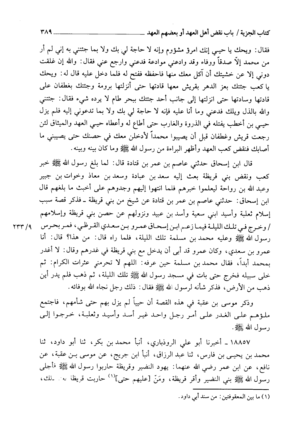 18857 - أَخْبَرَنَا أَبُو عَلِيٍّ الرُّوذْبَارِيُّ، أنبأ مُحَمَّدُ بْنُ بَكْرٍ، ثنا أَبُو دَاوُدَ، ثنا مُحَمَّدُ بْنُ يَحْيَى بْنِ فَارِسٍ، ثنا عَبْدُ الرَّزَّاقِ، أنبأ ابْنُ جُرَيْجٍ، عَنْ مُوسَى بْنِ عُقْبَةَ، عَنْ نَافِعٍ، عَنِ ابْنِ عُمَرَ رَضِيَ اللهُ عَنْهُمَا أَنَّ يَهُودَ النَّضِيرِ وَقُرَيْظَةَ §حَارَبُوا رَسُولَ اللهِ صَلَّى اللهُ عَلَيْهِ وَسَلَّمَ , فَأَجْلَى رَسُولُ اللهِ صَلَّى اللهُ عَلَيْهِ وَسَلَّمَ بَنِي النَّضِيرِ وَأَقَرَّ قُرَيْظَةَ وَمَنَّ عَلَيْهِمْ حَتَّى حَارَبَتْ قُرَيْظَةُ بَعْدَ ذَلِكَ -[390]- فَقَتَلَ رِجَالَهُمْ وَقَسَمَ نِسَاءَهُمْ وَأَمْوَالَهُمْ وَأَوْلَادَهُمْ بَيْنَ الْمُسْلِمِينَ إِلَّا بَعْضَهُمْ لَحِقُوا بِرَسُولِ اللهِ صَلَّى اللهُ عَلَيْهِ وَسَلَّمَ فَأَمَّنَهُمْ وَأَسْلَمُوا. أَخْرَجَاهُ فِي الصَّحِيحِ كَمَا مَضَى