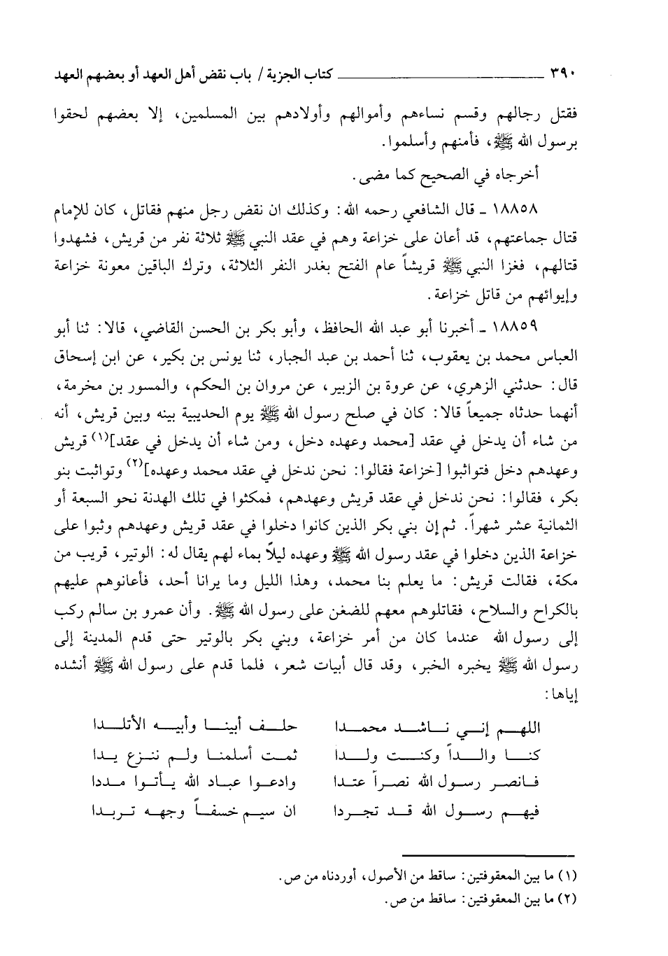 18859 - أَخْبَرَنَا أَبُو عَبْدِ اللهِ الْحَافِظُ، وَأَبُو بَكْرِ بْنُ الْحَسَنِ الْقَاضِي قَالَا: ثنا أَبُو الْعَبَّاسِ مُحَمَّدُ بْنُ يَعْقُوبَ , ثنا أَحْمَدُ بْنُ عَبْدِ الْجَبَّارِ، ثنا يُونُسُ بْنُ بُكَيْرٍ، عَنِ ابْنِ إِسْحَاقَ، قَالَ: حَدَّثَنِي الزُّهْرِيُّ، عَنْ عُرْوَةَ بْنِ الزُّبَيْرِ، عَنْ مَرْوَانَ بْنِ الْحَكَمِ، وَالْمِسْوَرِ بْنِ مَخْرَمَةَ، أَنَّهُمَا حَدَّثَاهُ جَمِيعًا، قَالَا: كَانَ فِي صُلْحِ رَسُولِ اللهِ صَلَّى اللهُ عَلَيْهِ وَسَلَّمَ يَوْمَ الْحُدَيْبِيَةِ بَيْنَهُ وَبَيْنَ قُرَيْشٍ أَنَّهُ مَنْ شَاءَ أَنْ يَدْخُلَ فِي عَقْدِ مُحَمَّدٍ وَعَهْدِهِ دَخَلَ , وَمَنْ شَاءَ أَنْ يَدْخُلَ فِي عَقْدِ قُرَيْشٍ وَعَهْدِهِمْ دَخَلَ , فَتَوَاثَبُوا خُزَاعَةُ فَقَالُوا: نَحْنُ نَدْخُلُ فِي عَقْدِ مُحَمَّدٍ وَعَهْدِهِ , وَتَوَاثَبَتْ بَنُو بَكْرٍ فَقَالُوا: نَحْنُ نَدْخُلُ فِي عَقْدِ قُرَيْشٍ وَعَهْدِهِمْ. فَمَكَثُوا فِي تِلْكَ الْهُدْنَةِ نَحْوَ السَّبْعَةَ أَوِ الثَّمَانِيَةَ عَشَرَ شَهْرًا , ثُمَّ إِنَّ بَنِي بَكْرٍ الَّذِينَ كَانُوا دَخَلُوا فِي عَقْدِ قُرَيْشٍ وَعَهْدِهِمْ وَثَبُوا عَلَى خُزَاعَةَ الَّذِينَ دَخَلُوا فِي عَقْدِ رَسُولِ اللهِ صَلَّى اللهُ عَلَيْهِ وَسَلَّمَ وَعَهْدِهِ لَيْلًا بِمَاءٍ لَهُمْ يُقَالُ لَهُ الْوَتِيرُ قَرِيبٍ مِنْ مَكَّةَ , فَقَالَتْ قُرَيْشٌ: مَا يَعْلَمُ بِنَا مُحَمَّدٌ، وَهَذَا اللَّيْلُ وَمَا يَرَانَا أَحَدٌ. فَأَعَانُوهُمْ عَلَيْهِمْ بِالْكُرَاعِ وَالسِّلَاحِ، فَقَاتَلُوهُمْ مَعَهُمْ لِلضَّغْنِ عَلَى رَسُولِ اللهِ صَلَّى اللهُ عَلَيْهِ وَسَلَّمَ، وَإِنَّ عَمْرَو بْنَ سَالِمٍ رَكِبَ إِلَى رَسُولِ اللهِ صَلَّى اللهُ عَلَيْهِ وَسَلَّمَ عِنْدَمَا كَانَ مِنْ أَمْرِ خُزَاعَةَ وَبَنِي بَكْرٍ بِالْوَتِيرِ حَتَّى قَدِمَ الْمَدِينَةَ إِلَى رَسُولِ اللهِ صَلَّى اللهُ عَلَيْهِ وَسَلَّمَ يُخْبِرُهُ الْخَبَرَ وَقَدْ قَالَ أَبْيَاتَ شِعْرٍ , فَلَمَّا قَدِمَ عَلَى رَسُولِ اللهِ صَلَّى اللهُ عَلَيْهِ وَسَلَّمَ أَنْشَدَهُ إِيَّاهَا: