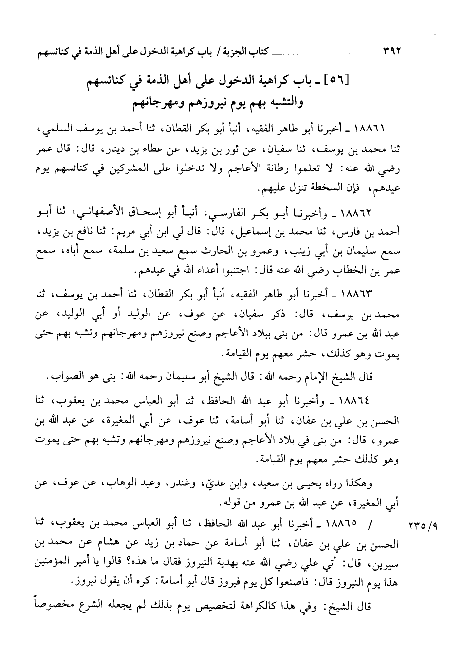 18863 - أَخْبَرَنَا أَبُو طَاهِرٍ الْفَقِيهُ، أنبأ أَبُو بَكْرٍ الْقَطَّانُ، ثنا أَحْمَدُ بْنُ يُوسُفَ، ثنا مُحَمَّدُ بْنُ يُوسُفَ، قَالَ: ذَكَرَ سُفْيَانُ عَنْ عَوْفٍ، عَنِ الْوَلِيدِ أَوْ أَبِي الْوَلِيدِ , عَنْ عَبْدِ اللهِ بْنِ عَمْرو، قَالَ: §" مَنْ بَنَى بِبِلَادِ الْأَعَاجِمِ وَصَنَعَ نَيْرُوزَهُمْ وَمِهْرَجَانَهُمْ وَتَشَبَّهَ بِهِمْ حَتَّى يَمُوتَ وَهُوَ كَذَلِكَ حُشِرَ مَعَهُمْ يَوْمَ الْقِيَامَةِ ". قَالَ الشَّيْخُ الْإِمَامُ رَحِمَهُ اللهُ: قَالَ الشَّيْخُ أَبُو سُلَيْمَانَ رَحِمَهُ اللهُ: بَنَى هُوَ الصَّوَابُ