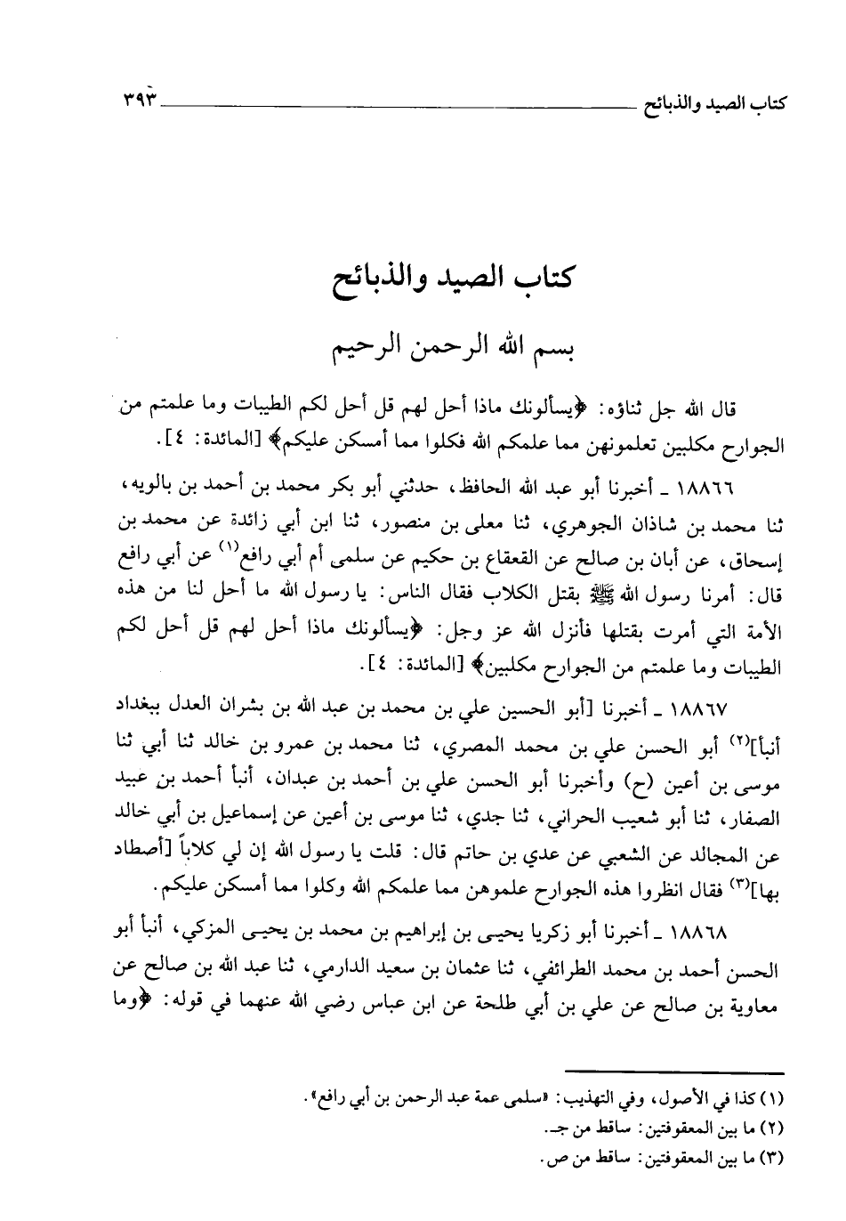 18867 - أَخْبَرَنَا أَبُو الْحُسَيْنِ عَلِيُّ بْنُ مُحَمَّدِ بْنِ عَبْدِ اللهِ بْنِ بِشْرَانَ الْعَدْلُ بِبَغْدَادَ , أنبأ أَبُو الْحَسَنِ عَلِيُّ بْنُ مُحَمَّدٍ الْمِصْرِيُّ , ثنا مُحَمَّدُ بْنُ عَمْرِو بْنِ خَالِدٍ، ثنا أَبِي، ثنا مُوسَى بْنُ أَعْيَنَ، ح وَأَخْبَرَنَا أَبُو الْحَسَنِ عَلِيُّ بْنُ أَحْمَدَ بْنِ عَبْدَانَ , أنبأ أَحْمَدُ بْنُ عُبَيْدٍ الصَّفَّارُ، ثنا أَبُو شُعَيْبٍ الْحَرَّانِيُّ، ثنا جَدِّي، ثنا مُوسَى بْنُ أَعْيَنَ، عَنْ إِسْمَاعِيلَ بْنِ أَبِي خَالِدٍ، عَنِ الْمُجَالِدِ، عَنِ الشَّعْبِيِّ، عَنْ عَدِيِّ بْنِ حَاتِمٍ، قَالَ: قُلْتُ: يَا رَسُولَ اللهِ إِنَّ لِي كِلَابًا أَصْطَادُ بِهَا , فَقَالَ: انْظُرُوا هَذِهِ الْجَوَارِحَ §عَلِّمُوهُنَّ مِمَّا عَلَّمَكُمُ اللهُ وَكُلُوا مِمَّا أَمْسَكْنَ عَلَيْكُمْ "