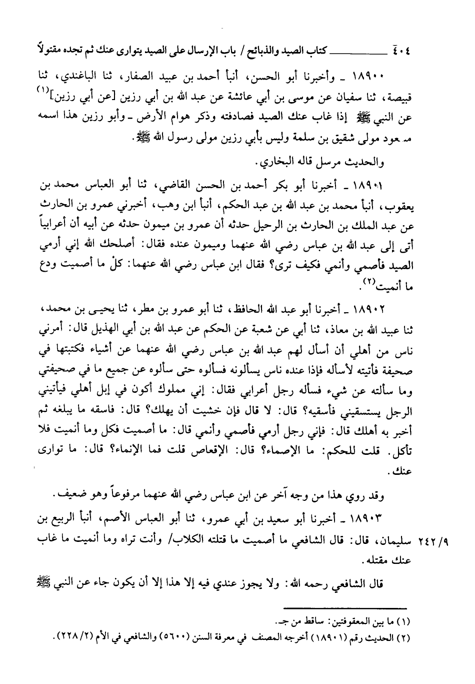18903 - أَخْبَرَنَا أَبُو سَعِيدِ بْنُ أَبِي عَمْرٍو، ثنا أَبُو الْعَبَّاسِ الْأَصَمُّ، أنبأ الرَّبِيعُ بْنُ سُلَيْمَانَ، قَالَ: قَالَ الشَّافِعِيُّ: §مَا أَصْمَيْتَ: مَا قَتَلَتْهُ الْكِلَابُ وَأَنْتَ تَرَاهُ , وَمَا أَنْمَيْتَ: مَا غَابَ عَنْكَ مَقْتَلُهُ. قَالَ الشَّافِعِيُّ رَحِمَهُ اللهُ: وَلَا يَجُوزُ عِنْدِي فِيهِ إِلَّا هَذَا , إِلَّا أَنْ يَكُونَ جَاءَ عَنِ النَّبِيِّ صَلَّى اللهُ عَلَيْهِ وَسَلَّمَ -[405]- شَيْءٌ فَإِنِّي أَتَوَهَّمُهُ فَيَسْقُطَ كُلُّ شَيْءٍ خَالَفَ أَمْرَ النَّبِيِّ صَلَّى اللهُ عَلَيْهِ وَسَلَّمَ وَلَا يَقُومَ مَعَهُ رَأْيٌ وَلَا قِيَاسٌ فَإِنَّ اللهَ قَطَعَ الْعُذْرَ لِقَوْلِهِ صَلَّى اللهُ عَلَيْهِ وَسَلَّمَ. قَالَ الشَّيْخُ: وَهَذَا الَّذِي تَوَهَّمَهُ الشَّافِعِيُّ رَحِمَهُ اللهُ فِيمَا