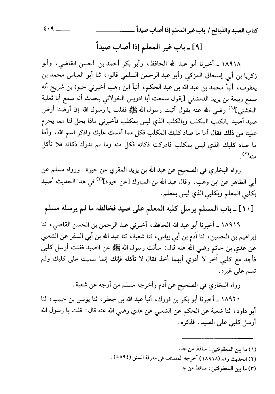 18918 - أَخْبَرَنَا أَبُو عَبْدِ اللهِ الْحَافِظُ، وَأَبُو بَكْرٍ أَحْمَدُ بْنُ الْحَسَنِ الْقَاضِي , وَأَبُو زَكَرِيَّا بْنُ أَبِي إِسْحَاقَ الْمُزَكِّي , وَأَبُو عَبْدِ الرَّحْمَنِ السُّلَمِيُّ قَالُوا: ثنا أَبُو الْعَبَّاسِ مُحَمَّدُ بْنُ يَعْقُوبَ , أنبأ مُحَمَّدُ بْنُ عَبْدِ اللهِ بْنِ عَبْدِ الْحَكَمِ، أنبأ ابْنُ وَهْبٍ، أَخْبَرَنِي حَيْوَةُ بْنُ شُرَيْحٍ، أَنَّهُ سَمِعَ رَبِيعَةَ بْنَ يَزِيدَ الدِّمَشْقِيَّ يَقُولُ: سَمِعْتُ أَبَا إِدْرِيسَ الْخَوْلَانِيَّ يُحَدِّثُ أَنَّهُ سَمِعَ أَبَا ثَعْلَبَةَ الْخُشَنِيَّ رَضِيَ اللهُ عَنْهُ يَقُولُ: أَتَيْتُ رَسُولَ اللهِ صَلَّى اللهُ عَلَيْهِ وَسَلَّمَ فَقُلْتُ: يَا رَسُولَ اللهِ إِنَّ أَرْضَنَا أَرْضُ صَيْدٍ أَصِيدُ بِالْكَلْبِ الْمُكَلَّبِ وَبِالْكَلْبِ الَّذِي لَيْسَ بِمُكَلَّبٍ , فَأَخْبِرْنِي مَاذَا يَحِلُّ لَنَا مِمَّا يَحْرُمُ عَلَيْنَا مِنْ ذَلِكَ. فَقَالَ: أَمَّا §مَا صَادَ كَلْبُكَ الْمُكَلَّبُ فَكُلْ مِمَّا أَمْسَكَ عَلَيْكَ وَاذْكُرِ اسْمَ اللهِ , وَأَمَّا مَا صَادَ كَلْبُكَ الَّذِي لَيْسَ بِمُكَلَّبٍ فَأَدْرَكْتَ ذَكَاتَهُ فَكُلْ مِنْهُ , وَمَا لَمْ تُدْرِكْ ذَكَاتَهُ فَلَا تَأْكُلْ مِنْهُ ". رَوَاهُ الْبُخَارِيُّ فِي الصَّحِيحِ عَنْ عَبْدِ اللهِ بْنِ يَزِيدَ الْمُقْرِئِ عَنْ حَيْوَةَ , وَرَوَاهُ مُسْلِمٌ عَنْ أَبِي الطَّاهِرِ عَنِ ابْنِ وَهْبٍ. وَقَالَ عَبْدُ اللهِ بْنُ الْمُبَارَكِ عَنْ حَيْوَةَ فِي هَذَا الْحَدِيثِ: أَصِيدُ بِكَلْبِي الْمُعَلَّمِ وَبِكَلْبِي الَّذِي لَيْسَ بِمُعَلَّمٍ
