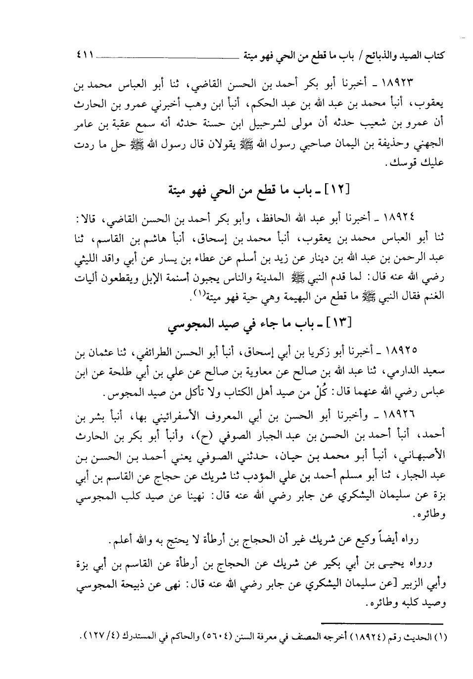 18924 - أَخْبَرَنَا أَبُو عَبْدِ اللهِ الْحَافِظُ، وَأَبُو بَكْرٍ أَحْمَدُ بْنُ الْحَسَنِ الْقَاضِي قَالَا: ثنا أَبُو الْعَبَّاسِ مُحَمَّدُ بْنُ يَعْقُوبَ , أنبأ مُحَمَّدُ بْنُ إِسْحَاقَ، أنبأ هَاشِمُ بْنُ الْقَاسِمِ، ثنا عَبْدُ الرَّحْمَنِ بْنُ عَبْدِ اللهِ بْنِ دِينَارٍ، عَنْ زَيْدِ بْنِ أَسْلَمَ، عَنْ عَطَاءِ بْنِ يَسَارٍ، عَنْ أَبِي وَاقِدٍ اللَّيْثِيِّ رَضِيَ اللهُ عَنْهُ قَالَ: لَمَّا قَدِمَ النَّبِيُّ صَلَّى اللهُ عَلَيْهِ وَسَلَّمَ الْمَدِينَةَ وَالنَّاسُ يَجُبُّونَ أَسْنِمَةَ الْإِبِلِ وَيَقْطَعُونَ أَلْيَاتِ الْغَنَمِ، فَقَالَ النَّبِيُّ صَلَّى اللهُ عَلَيْهِ وَسَلَّمَ: §" مَا قُطِعَ مِنَ الْبَهِيمَةِ وَهِيَ حَيَّةٌ فَهُوَ مَيْتَةٌ "