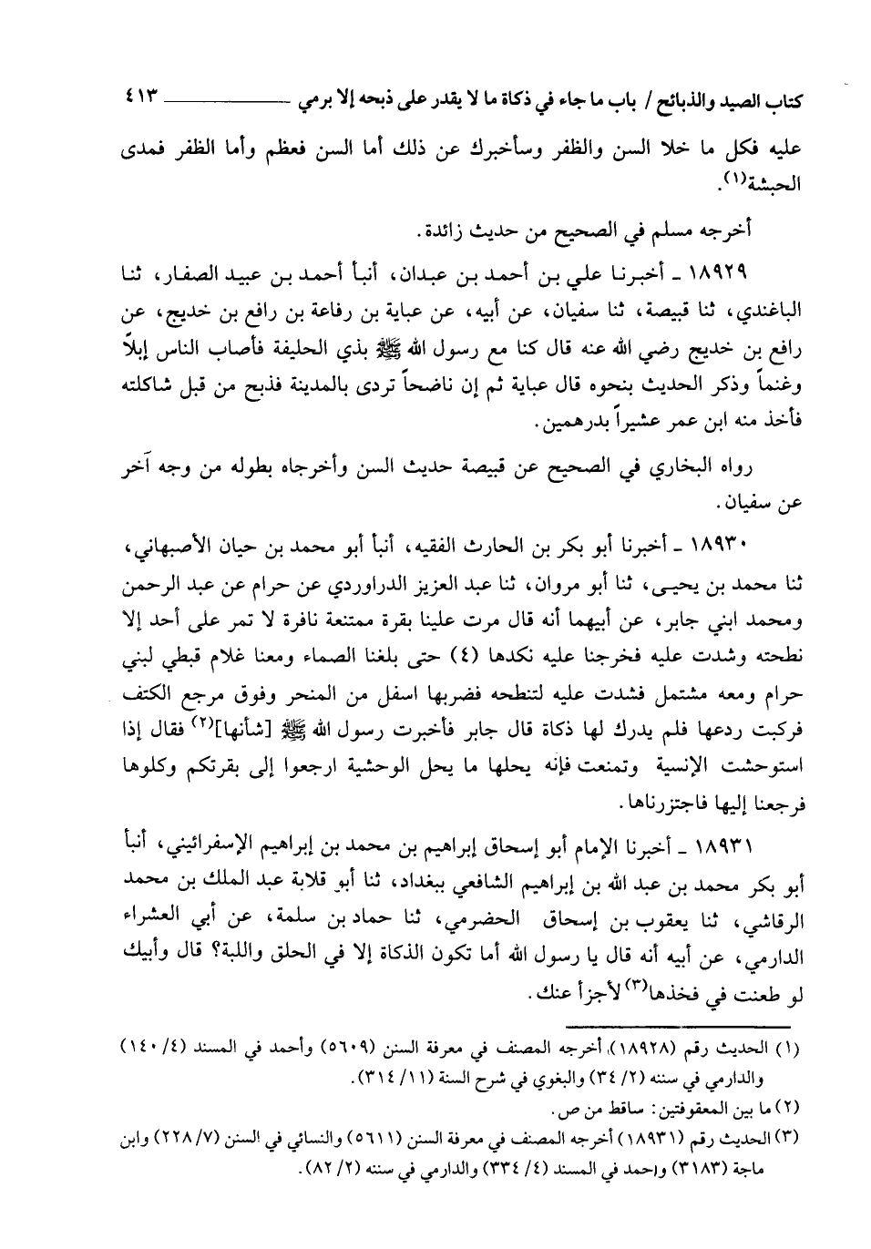 18930 - أَخْبَرَنَا أَبُو بَكْرِ بْنُ الْحَارِثِ الْفَقِيهُ، أنبأ أَبُو مُحَمَّدِ بْنُ حَيَّانَ الْأَصْبَهَانِيُّ، ثنا مُحَمَّدُ بْنُ يَحْيَى، ثنا أَبُو مَرْوَانَ، ثنا عَبْدُ الْعَزِيزِ الدَّرَاوَرْدِيُّ، عَنْ حَرَامٍ، عَنْ عَبْدِ الرَّحْمَنِ وَمُحَمَّدٍ ابْنَيْ جَابِرٍ , عَنْ أَبِيهِمَا، أَنَّهُ قَالَ: مَرَّتْ عَلَيْنَا بَقَرَةٌ مُمْتَنِعَةٌ نَافِرَةٌ لَا تَمُرُّ عَلَى أَحَدٍ إِلَّا نَطَحَتْهُ وَشَدَّتْ عَلَيْهِ , فَخَرَجْنَا عَلَيْهِ نُكِدُّهَا حَتَّى بَلَغْنَا الصَّمَّاءَ وَمَعَنَا غُلَامٌ قِبْطِيٌّ لِبَنِي حَرَامٍ وَمَعَهُ مُشْتَمَلٌ فَشَدَّتْ عَلَيْهِ لِتَنْطَحَهُ فَضَرَبَهَا أَسْفَلَ مِنَ الْمَنْحَرِ وَفَوْقَ مَرْجِعِ الْكَتِفِ فَرَكِبَتْ رَدْعَهَا فَلَمْ يُدْرَكْ لَهَا ذَكَاةٌ. قَالَ جَابِرٌ: فَأَخْبَرْتُ رَسُولَ اللهِ صَلَّى اللهُ عَلَيْهِ وَسَلَّمَ شَأْنَهَا فَقَالَ: §" إِذَا اسْتَوْحَشَتِ الْإِنْسِيَّةُ وَتَمَنَّعَتْ فَإِنَّهُ يُحِلُّهَا مَا يُحِلُّ الْوَحْشِيَّةَ , ارْجِعُوا إِلَى بَقَرَتِكُمْ وَكُلُوهَا ". فَرَجَعْنَا إِلَيْهَا فَاجْتَزَرْنَاهَا