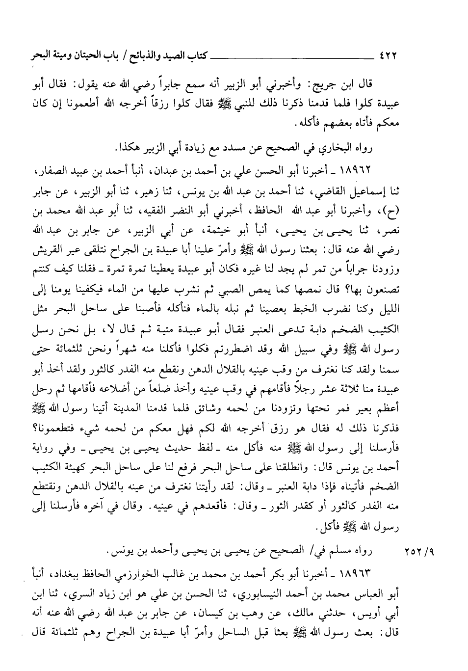18962 - أَخْبَرَنَا أَبُو الْحَسَنِ عَلِيُّ بْنُ أَحْمَدَ بْنِ عَبْدَانَ , أنبأ أَحْمَدُ بْنُ عُبَيْدٍ الصَّفَّارُ، ثنا إِسْمَاعِيلُ الْقَاضِي، ثنا أَحْمَدُ بْنُ عَبْدِ اللهِ بْنِ يُونُسَ، ثنا زُهَيْرٌ، ثنا أَبُو الزُّبَيْرِ، عَنْ جَابِرٍ، ح وَأَخْبَرَنَا أَبُو عَبْدِ اللهِ الْحَافِظُ، أَخْبَرَنِي أَبُو النَّضْرِ الْفَقِيهُ، ثنا أَبُو عَبْدِ اللهِ مُحَمَّدُ بْنُ نَصْرٍ , ثنا يَحْيَى بْنُ يَحْيَى، أنبأ أَبُو خَيْثَمَةَ، عَنْ أَبِي الزُّبَيْرِ، عَنْ جَابِرِ بْنِ عَبْدِ اللهِ رَضِيَ اللهُ عَنْهُ قَالَ: بَعَثَنَا رَسُولُ اللهِ صَلَّى اللهُ عَلَيْهِ وَسَلَّمَ وَأَمَّرَ عَلَيْنَا أَبَا عُبَيْدَةَ بْنَ الْجَرَّاحِ نَتَلَقَّى عِيرًا لِقُرَيْشٍ وَزَوَّدَنَا جِرَابًا مِنْ تَمْرٍ لَمْ يَجِدْ لَنَا غَيْرَهُ , فَكَانَ أَبُو عُبَيْدَةَ يُعْطِينَا تَمْرَةً تَمْرَةً , فَقُلْنَا: كَيْفَ كُنْتُمْ تَصْنَعُونَ بِهَا؟ قَالَ: نَمُصُّهَا كَمَا يَمُصُّ الصَّبِيُّ ثُمَّ نَشْرَبُ عَلَيْهَا مِنَ الْمَاءِ فَيَكْفِينَا يَوْمَنَا إِلَى اللَّيْلِ , وَكُنَّا نَضْرِبُ الْخَبَطَ بِعِصِيِّنَا ثُمَّ نَبُلُّهُ بِالْمَاءِ فَنَأْكُلُهُ , فَأَصَبْنَا عَلَى سَاحِلِ الْبَحْرِ مِثْلَ الْكَثِيبِ الضَّخْمِ دَابَّةً تُدْعَى الْعَنْبَرَ , فَقَالَ أَبُو عُبَيْدَةَ: مَيْتَةٌ , ثُمَّ قَالَ: لَا بَلْ نَحْنُ رُسُلُ رَسُولِ اللهِ صَلَّى اللهُ عَلَيْهِ وَسَلَّمَ وَفِي سَبِيلِ اللهِ وَقَدِ اضْطُرِرْتُمْ فَكُلُوا , فَأَكَلْنَا مِنْهُ شَهْرًا وَنَحْنُ ثَلَاثُمِائَةٍ حَتَّى سَمِنَّا , وَلَقَدْ كُنَّا نَغْتَرِفُ مِنْ وَقْبِ عَيْنَيْهِ بِالْقِلَالِ الدُّهْنَ , وَنَقْطَعُ مِنْهُ الْفِدَرَ كَالثَّوْرِ , وَلَقَدْ أَخَذَ أَبُو عُبَيْدَةَ مِنَّا ثَلَاثَةَ عَشَرَ رَجُلًا فَأَقَامَهُمْ فِي وَقْبِ عَيْنَيْهِ , وَأَخَذَ ضِلَعًا مِنْ أَضْلَاعِهِ فَأَقَامَهَا ثُمَّ رَحَلَ أَعْظَمَ بَعِيرٍ فَمَرَّ تَحْتَهَا وَتَزَوَّدْنَا مِنْ لَحْمِهِ وَشَائِقَ , فَلَمَّا قَدِمْنَا الْمَدِينَةَ أَتَيْنَا رَسُولَ اللهِ صَلَّى اللهُ عَلَيْهِ وَسَلَّمَ فَذَكَرْنَا ذَلِكَ لَهُ فَقَالَ: " هُوَ §رِزْقٌ أَخْرَجَهُ اللهُ لَكُمْ , فَهَلْ مَعَكُمْ مِنْ لَحْمِهِ شَيْءٌ فَتُطْعِمُونَا؟ ". فَأَرْسَلْنَا إِلَى رَسُولِ اللهِ صَلَّى اللهُ عَلَيْهِ وَسَلَّمَ مِنْهُ فَأَكَلَ مِنْهُ لَفْظُ حَدِيثِ يَحْيَى بْنِ يَحْيَى , وَفِي رِوَايَةِ أَحْمَدَ بْنِ يُونُسَ قَالَ: وَانْطَلَقْنَا عَلَى سَاحِلِ الْبَحْرِ فَرُفِعَ لَنَا عَلَى سَاحِلِ الْبَحْرِ كَهَيْئَةِ الْكَثِيبِ الضَّخْمِ فَأَتَيْنَاهُ , فَإِذَا دَابَّةُ الْعَنْبَرِ , وَقَالَ: لَقَدْ رَأَيْتُنَا نَغْتَرِفُ مِنْ عَيْنِهِ بِالْقِلَالِ الدُّهْنَ وَنَقْتَطِعُ مِنْهُ الْفِدَرَ كَالثَّوْرِ أَوْ كَقَدْرِ الثَّوْرِ , وَقَالَ: فَأَقْعَدَهُمْ فِي عَيْنَيْهِ. وَقَالَ فِي آخِرِهِ: فَأَرْسَلْنَا إِلَى رَسُولِ اللهِ صَلَّى اللهُ عَلَيْهِ وَسَلَّمَ فَأَكَلَ. رَوَاهُ مُسْلِمٌ فِي الصَّحِيحِ عَنْ يَحْيَى بْنِ يَحْيَى وَأَحْمَدَ بْنِ يُونُسَ