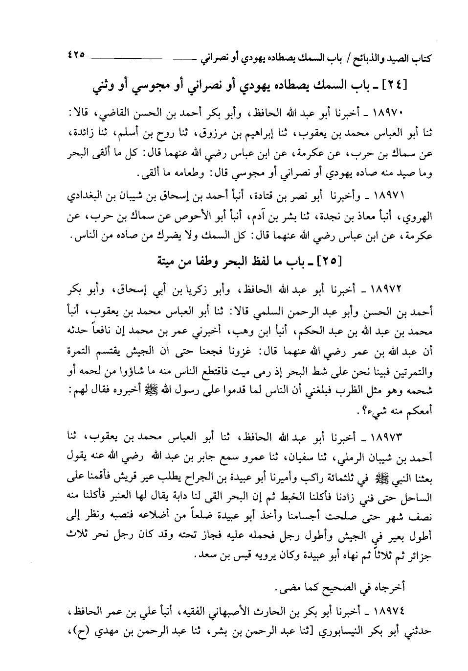 18973 - أَخْبَرَنَا أَبُو عَبْدِ اللهِ الْحَافِظُ، ثنا أَبُو الْعَبَّاسِ مُحَمَّدُ بْنُ يَعْقُوبَ , ثنا أَحْمَدُ بْنُ شَيْبَانَ الرَّمْلِيُّ، ثنا سُفْيَانُ، ثنا عَمْرٌو، سَمِعَ جَابِرَ بْنَ عَبْدِ اللهِ رَضِيَ اللهُ عَنْهُ يَقُولُ: بَعَثَنَا النَّبِيُّ صَلَّى اللهُ عَلَيْهِ وَسَلَّمَ فِي ثَلَاثِمِائَةِ رَاكِبٍ وَأَمِيرُنَا أَبُو عُبَيْدَةَ بْنُ الْجَرَّاحِ يَطْلُبُ عِيرَ قُرَيْشٍ , فَأَقَمْنَا عَلَى السَّاحِلِ حَتَّى فَنِيَ زَادُنَا فَأَكَلْنَا الْخَبَطَ , ثُمَّ إِنَّ §الْبَحْرَ أَلْقَى لَنَا دَابَّةً يُقَالُ لَهَا الْعَنْبَرُ فَأَكَلْنَا مِنْهُ نِصْفَ شَهْرٍ حَتَّى صَلُحَتْ أَجْسَامُنَا , وَأَخَذَ أَبُو عُبَيْدَةَ ضِلَعًا مِنْ أَضْلَاعِهِ فَنَصَبَهُ وَنَظَرَ إِلَى أَطْوَلِ بَعِيرٍ فِي الْجَيْشِ وَأَطْوَلِ رَجُلٍ فَحَمَلَهُ عَلَيْهِ فَجَازَ تَحْتَهُ , وَقَدْ كَانَ رَجُلٌ نَحَرَ ثَلَاثَ جَزَائِرَ ثُمَّ ثَلَاثًا ثُمَّ نَهَاهُ أَبُو عُبَيْدَةَ. وَكَانَ يَرْوِيهِ قَيْسُ بْنُ سَعْدٍ. أَخْرَجَاهُ فِي الصَّحِيحِ كَمَا مَضَى