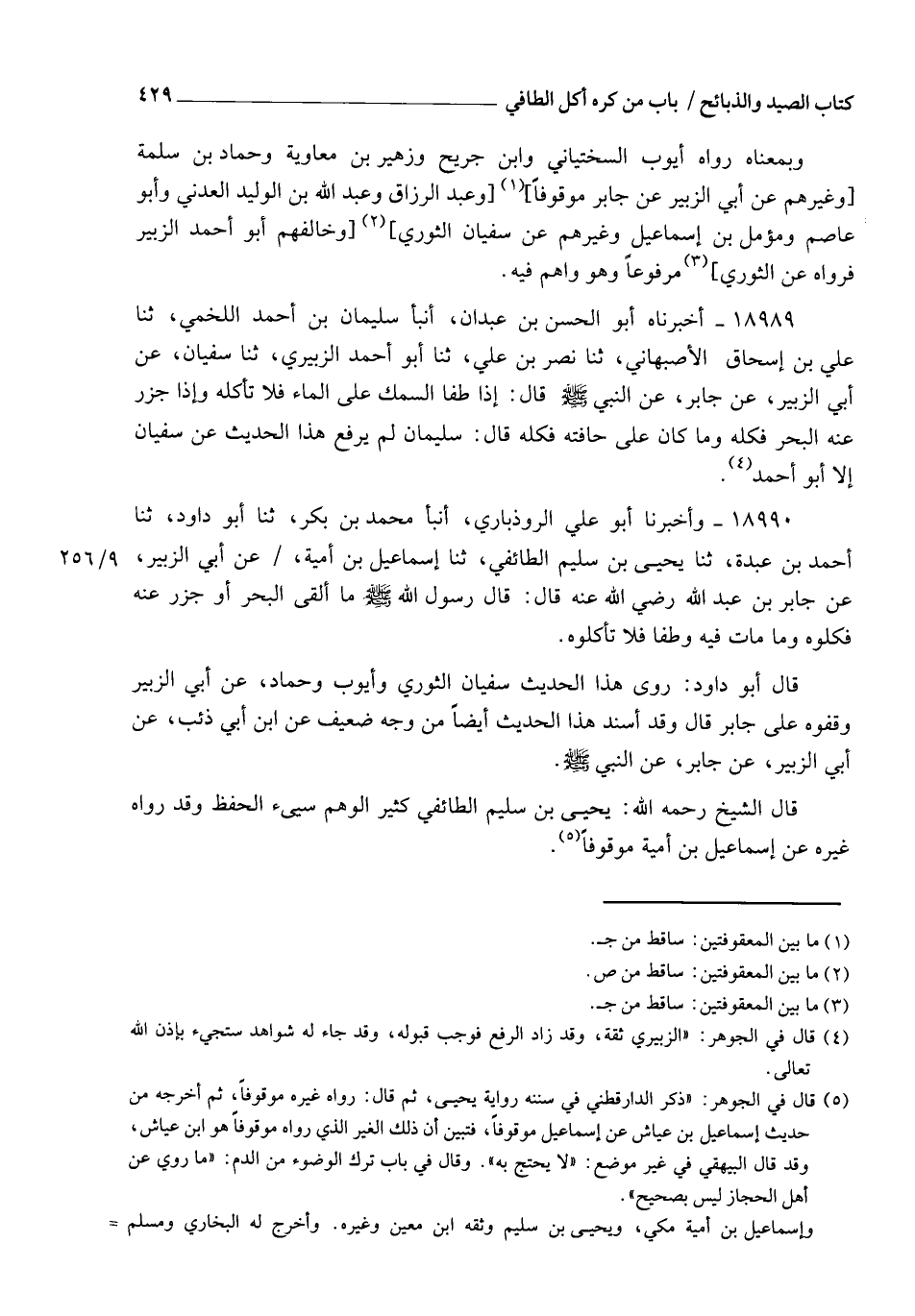 18990 - وَأَخْبَرَنَا أَبُو عَلِيٍّ الرُّوذْبَارِيُّ، أنبأ مُحَمَّدُ بْنُ بَكْرٍ، ثنا أَبُو دَاوُدَ، ثنا أَحْمَدُ بْنُ عَبْدَةَ، ثنا يَحْيَى بْنُ سُلَيْمٍ الطَّائِفِيُّ، ثنا إِسْمَاعِيلُ بْنُ أُمَيَّةَ، عَنْ أَبِي الزُّبَيْرِ، عَنْ جَابِرِ بْنِ عَبْدِ اللهِ رَضِيَ اللهُ عَنْهُ قَالَ: قَالَ رَسُولُ اللهِ صَلَّى اللهُ عَلَيْهِ وَسَلَّمَ: §" مَا أَلْقَى الْبَحْرُ أَوْ جَزَرَ عَنْهُ فَكُلُوهُ , وَمَا مَاتَ فِيهِ وَطَفَا فَلَا تَأْكُلُوهُ ". قَالَ أَبُو دَاوُدَ: رَوَى هَذَا الْحَدِيثَ سُفْيَانُ الثَّوْرِيُّ وَأَيُّوبُ وَحَمَّادٌ عَنْ أَبِي الزُّبَيْرِ وَقَفُوهُ عَلَى جَابِرٍ. قَالَ: وَقَدْ أُسْنِدَ هَذَا الْحَدِيثُ أَيْضًا مِنْ وَجْهٍ ضَعِيفٍ عَنِ ابْنِ أَبِي ذِئْبٍ , عَنْ أَبِي الزُّبَيْرِ , عَنْ جَابِرٍ , عَنِ النَّبِيِّ صَلَّى اللهُ عَلَيْهِ وَسَلَّمَ. قَالَ الشَّيْخُ رَحِمَهُ اللهُ: يَحْيَى بْنُ سُلَيْمٍ الطَّائِفِيُّ كَثِيرُ الْوَهْمِ سَيِّئُ الْحِفْظِ , وَقَدْ رَوَاهُ غَيْرُهُ عَنْ إِسْمَاعِيلَ بْنِ أُمَيَّةَ مَوْقُوفًا , -[430]- وَرَوَاهُ أَبُو عِيسَى التِّرْمِذِيُّ مِنْ حَدِيثِ ابْنِ أَبِي ذِئْبٍ , عَنِ الْحُسَيْنِ بْنِ يَزِيدَ الْكُوفِيِّ , عَنْ حَفْصِ بْنِ غِيَاثٍ , عَنِ ابْنِ أَبِي ذِئْبٍ , عَنْ أَبِي الزُّبَيْرِ , عَنْ جَابِرٍ رَضِيَ اللهُ عَنْهُ , عَنِ النَّبِيِّ صَلَّى اللهُ عَلَيْهِ وَسَلَّمَ قَالَ: " مَا اصْطَدْتُمُوهُ وَهُوَ حَيٌّ فَكُلُوهُ , وَمَا وَجَدْتُمْ مَيِّتًا طَافِيًا فَلَا تَأْكُلُوهُ ". قَالَ أَبُو عِيسَى: سَأَلْتُ مُحَمَّدًا يَعْنِي الْبُخَارِيَّ عَنْ هَذَا الْحَدِيثِ فَقَالَ: لَيْسَ هَذَا بِمَحْفُوظٍ , وَيُرْوَى عَنْ جَابِرٍ خِلَافُ هَذَا , وَلَا أَعْرِفُ لِابْنِ أَبِي ذِئْبٍ عَنْ أَبِي الزُّبَيْرِ شَيْئًا. قَالَ الشَّيْخُ رَحِمَهُ اللهُ: وَقَدْ رَوَاهُ أَيْضًا يَحْيَى بْنُ أَبِي أُنَيْسَةَ عَنْ أَبِي الزُّبَيْرِ مَرْفُوعًا , وَيَحْيَى بْنُ أَبِي أُنَيْسَةَ مَتْرُوكٌ لَا يُحْتَجُّ بِهِ , وَرَوَاه عَبْدُ الْعَزِيزِ بْنُ عُبَيْدِ اللهِ , عَنْ وَهْبِ بْنِ كَيْسَانَ , عَنْ جَابِرٍ مَرْفُوعًا , وَعَبْدُ الْعَزِيزِ ضَعِيفٌ لَا يُحْتَجُّ بِهِ , وَرَوَاهُ بَقِيَّةُ بْنُ الْوَلِيدِ عَنِ الْأَوْزَاعِيِّ , عَنْ أَبِي الزُّبَيْرِ , عَنْ جَابِرٍ مَرْفُوعًا , وَلَا يُحْتَجُّ بِمَا يَنْفَرِدُ بِهِ بَقِيَّةُ , فَكَيْفَ بِمَا يُخَالَفُ فِيهِ , وَقَوْلُ الْجَمَاعَةِ مِنَ الصَّحَابَةِ عَلَى خِلَافِ قَوْلِ جَابِرٍ مَعَ مَا رُوِّينَا عَنِ النَّبِيِّ صَلَّى اللهُ عَلَيْهِ وَسَلَّمَ أَنَّهُ قَالَ فِي الْبَحْرِ: " هُوَ الطَّهُورُ مَاؤُهُ الْحِلُّ مَيْتَتُهُ ". وَبِاللهِ التَّوْفِيقُ