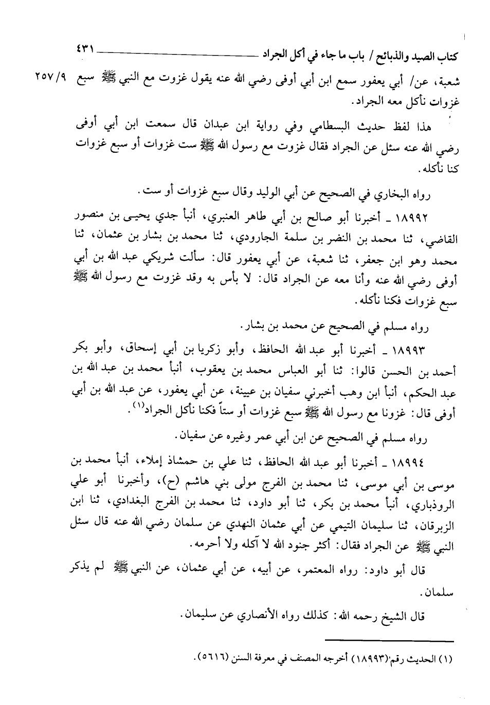 18993 - أَخْبَرَنَا أَبُو عَبْدِ اللهِ الْحَافِظُ، وَأَبُو زَكَرِيَّا بْنُ أَبِي إِسْحَاقَ , وَأَبُو بَكْرٍ أَحْمَدُ بْنُ الْحَسَنِ قَالُوا: ثنا أَبُو الْعَبَّاسِ مُحَمَّدُ بْنُ يَعْقُوبَ , أنبأ مُحَمَّدُ بْنُ عَبْدِ اللهِ بْنِ عَبْدِ الْحَكَمِ، أنبأ ابْنُ وَهْبٍ، أَخْبَرَنِي سُفْيَانُ بْنُ عُيَيْنَةَ، عَنْ أَبِي يَعْفُورٍ، عَنْ عَبْدِ اللهِ بْنِ أَبِي أَوْفَى، قَالَ: غَزَوْنَا مَعَ رَسُولِ اللهِ صَلَّى اللهُ عَلَيْهِ وَسَلَّمَ سَبْعَ غَزَوَاتٍ أَوْ سِتًّا فَكُنَّا §نَأْكُلُ الْجَرَادَ. رَوَاهُ مُسْلِمٌ فِي الصَّحِيحِ عَنِ ابْنِ أَبِي عُمَرَ وَغَيْرِهِ عَنْ سُفْيَانَ