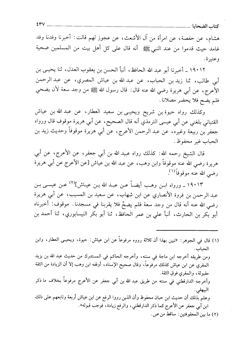 19012 - أَخْبَرَنَا أَبُو عَبْدِ اللهِ الْحَافِظُ، أنبأ الْحَسَنُ بْنُ يَعْقُوبَ الْعَدْلُ، ثنا يَحْيَى بْنُ أَبِي طَالِبٍ، ثنا زَيْدُ بْنُ الْحُبَابِ، عَنْ عَبْدِ اللهِ بْنِ عَيَّاشٍ الْمِصْرِيِّ، عَنْ عَبْدِ الرَّحْمَنِ الْأَعْرَجِ، عَنْ أَبِي هُرَيْرَةَ رَضِيَ اللهُ عَنْهُ قَالَ: قَالَ رَسُولُ اللهِ صَلَّى اللهُ عَلَيْهِ وَسَلَّمَ: §" مَنْ وَجَدَ سَعَةً لِأَنْ يُضَحِّيَ فَلَمْ يُضَحِّ فَلَا يَحْضُرْ مُصَلَّانَا ". وَكَذَلِكَ رَوَاهُ حَيْوَةُ بْنُ شُرَيْحٍ , وَيَحْيَى بْنُ سَعِيدٍ الْعَطَّارُ , عَنْ عَبْدِ اللهِ بْنِ عَيَّاشٍ الْقِتْبَانِيِّ , بَلَغَنِي عَنْ أَبِي عِيسَى التِّرْمِذِيِّ أَنَّهُ قَالَ: الصَّحِيحُ عَنْ أَبِي هُرَيْرَةَ مَوْقُوفٌ. قَالَ: وَرَوَاهُ جَعْفَرُ بْنُ رَبِيعَةَ وَغَيْرُهُ عَنْ عَبْدِ الرَّحْمَنِ الْأَعْرَجِ عَنْ أَبِي هُرَيْرَةَ مَوْقُوفًا , وَحَدِيثُ زَيْدِ بْنُ الْحُبَابِ غَيْرُ مَحْفُوظٍ. قَالَ الشَّيْخُ رَحِمَهُ اللهُ: كَذَلِكَ رَوَاهُ عُبَيْدُ اللهِ بْنُ أَبِي جَعْفَرٍ عَنِ الْأَعْرَجِ عَنْ أَبِي هُرَيْرَةَ رَضِيَ اللهُ عَنْهُ مَوْقُوفًا , وَابْنُ وَهْبٍ عَنْ عَبْدِ اللهِ بْنِ عَيَّاشٍ عَنِ الْأَعْرَجِ عَنْ أَبِي هُرَيْرَةَ رَضِيَ اللهُ عَنْهُ مَوْقُوفًا