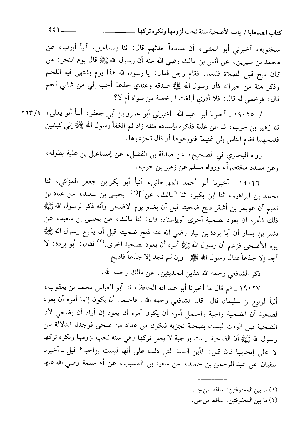 19025 - أَخْبَرَنَا أَبُو عَبْدِ اللهِ أَخْبَرَنِي أَبُو عَمْرِو بْنُ أَبِي جَعْفَرٍ، أنبأ أَبُو يَعْلَى، ثنا زُهَيْرُ بْنُ حَرْبٍ، ثنا ابْنُ عُلَيَّةَ، فَذَكَرَهُ بِإِسْنَادِهِ مِثْلَهُ زَادَ: ثُمَّ انْكَفَأَ رَسُولُ اللهِ صَلَّى اللهُ عَلَيْهِ وَسَلَّمَ إِلَى §كَبْشَيْنِ فَذَبَحَهُمَا فَقَامَ النَّاسُ إِلَى غَنِيمَةٍ فَتَوَزَّعُوهَا أَوْ قَالَ: تَجَزَّعُوهَا. رَوَاهُ الْبُخَارِيُّ فِي الصَّحِيحِ عَنْ صَدَقَةِ بْنِ الْفَضْلِ , عَنْ إِسْمَاعِيلَ ابْنِ عُلَيَّةَ بِطُولِهِ , وَعَنْ مُسَدَّدٍ مُخْتَصَرًا , وَرَوَاهُ مُسْلِمٌ عَنْ زُهَيْرِ بْنِ حَرْبٍ