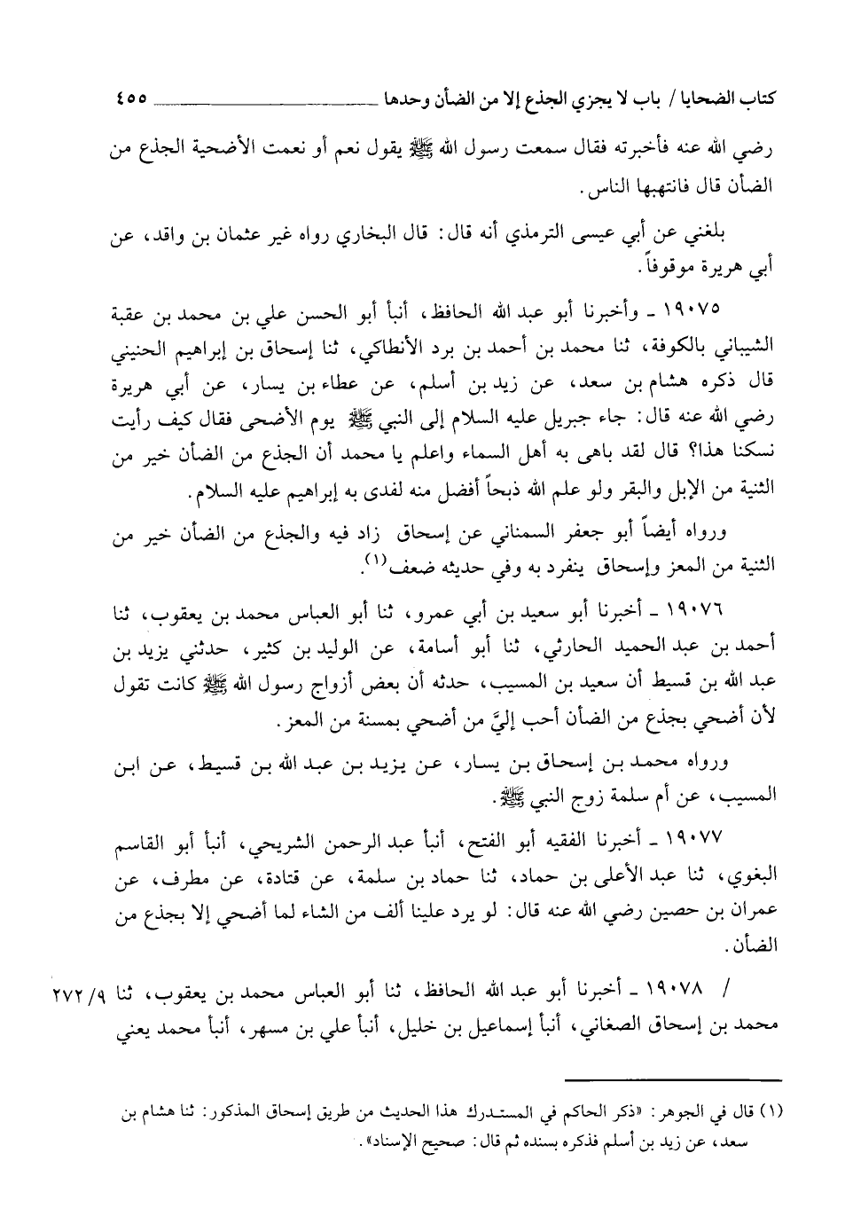 19077 - أَخْبَرَنَا الْفَقِيهُ أَبُو الْفَتْحِ، أنبأ عَبْدُ الرَّحْمَنِ الشُّرَيْحِيُّ، أنبأ أَبُو الْقَاسِمِ الْبَغَوِيُّ، ثنا عَبْدُ الْأَعْلَى بْنُ حَمَّادٍ، ثنا حَمَّادُ بْنُ سَلَمَةَ، عَنْ قَتَادَةَ، عَنْ مُطَرِّفٍ، عَنْ عِمْرَانَ بْنِ حُصَيْنٍ رَضِيَ اللهُ عَنْهُ قَالَ: §لَوْ يَرِدُ عَلَيْنَا أَلْفٌ مِنَ الشَّاءِ لَمَا أُضَحِّي إِلَّا بِجَذَعٍ مِنَ الضَّأْنِ