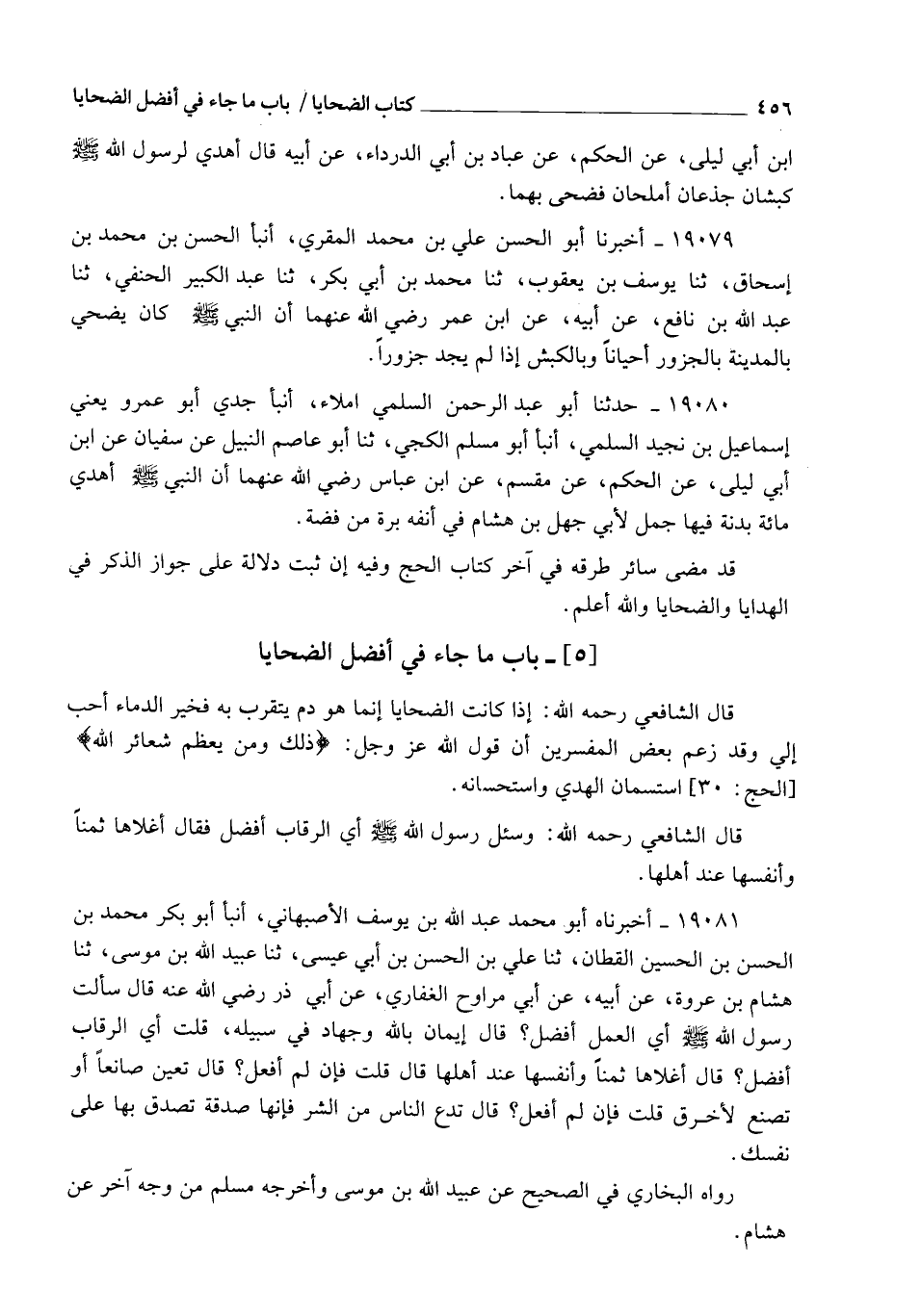 19080 - حَدَّثَنَا أَبُو عَبْدِ الرَّحْمَنِ السُّلَمِيُّ إِمْلَاءً , أنبأ جَدِّي أَبُو عَمْرٍو يَعْنِي إِسْمَاعِيلَ بْنَ نُجَيْدٍ السُّلَمِيَّ، أنبأ أَبُو مُسْلِمٍ الْكَجِّيُّ، ثنا أَبُو عَاصِمٍ النَّبِيلُ، عَنْ سُفْيَانَ، عَنِ ابْنِ أَبِي لَيْلَى، عَنِ الْحَكَمِ، عَنْ مِقْسَمٍ، عَنِ ابْنِ عَبَّاسٍ رَضِيَ اللهُ عَنْهُمَا أَنَّ النَّبِيَّ صَلَّى اللهُ عَلَيْهِ وَسَلَّمَ §أُهْدِيَ مِائَةَ بَدَنَةً فِيهَا جَمَلٌ لِأَبِي جَهْلِ بْنِ هِشَامٍ فِي أَنْفِهِ بَرَّةٌ مِنْ فِضَّةٍ. قَدْ مَضَى سَائِرُ طُرُقِهِ فِي آخِرِ كِتَابِ الْحَجِّ , وَفِيهِ إِنْ ثَبَتَ دَلَالَةٌ عَلَى جَوَازِ الذِّكْرِ فِي الْهَدَايَا وَالضَّحَايَا وَاللهُ أَعْلَمُ