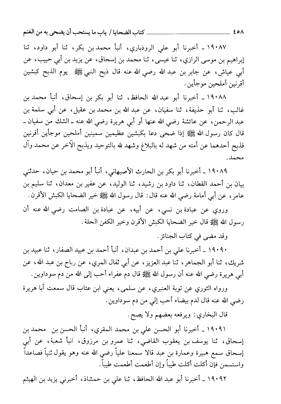 19087 - أَخْبَرَنَا أَبُو عَلِيٍّ الرُّوذْبَارِيُّ، أنبأ مُحَمَّدُ بْنُ بَكْرٍ، ثنا أَبُو دَاوُدَ، ثنا إِبْرَاهِيمُ بْنُ مُوسَى الرَّازِيُّ، ثنا عِيسَى، ثنا مُحَمَّدُ بْنُ إِسْحَاقَ، عَنْ يَزِيدَ بْنِ أَبِي حَبِيبٍ، عَنْ أَبِي عَيَّاشٍ، عَنْ جَابِرِ بْنِ عَبْدِ اللهِ رَضِيَ اللهُ عَنْهُ قَالَ: §ذَبَحَ النَّبِيُّ صَلَّى اللهُ عَلَيْهِ وَسَلَّمَ يَوْمَ الذَّبْحِ كَبْشَيْنِ أَقْرَنَيْنِ أَمْلَحَيْنِ مُوجَأَيْنِ