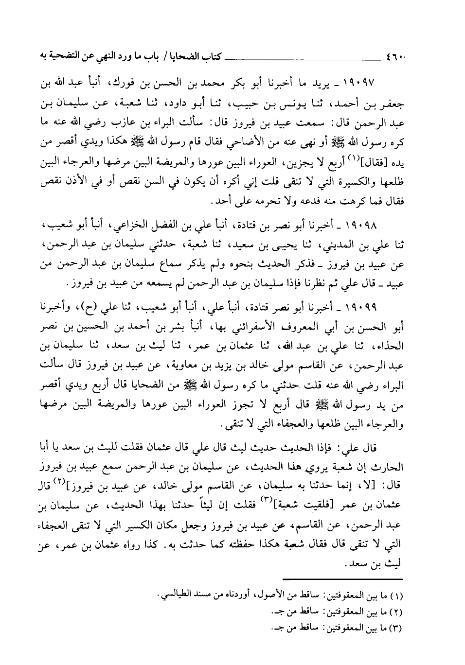 19099 - أَخْبَرَنَا أَبُو نَصْرٍ بْنُ قَتَادَةُ , أنبأ عَلِيٌّ، أنبأ أَبُو شُعَيْبٍ، ثنا عَلِيٌّ، ح وَأَخْبَرَنَا أَبُو الْحَسَنِ بْنُ أَبِي الْمَعْرُوفِ الِاسْفِرَايِينِيُّ بِهَا، أنبأ بِشْرُ بْنُ أَحْمَدَ ثنا أَحْمَدُ بْنُ الْحُسَيْنِ بْنِ نَصْرٍ الْحَذَّاءُ، ثنا عَلِيُّ بْنُ عَبْدِ اللهِ، ثنا عُثْمَانُ بْنُ عُمَرَ، ثنا لَيْثُ بْنُ سَعْدٍ، ثنا سُلَيْمَانُ بْنُ عَبْدِ الرَّحْمَنِ، عَنِ الْقَاسِمِ مَوْلَى خَالِدِ بْنِ يَزِيدَ بْنِ مُعَاوِيَةَ , عَنْ عُبَيْدِ بْنِ فَيْرُوزَ، قَالَ: سَأَلْتُ الْبَرَاءَ رَضِيَ اللهُ عَنْهُ قُلْتُ: حَدِّثْنِي مَا كَرِهَ رَسُولُ اللهِ صَلَّى اللهُ عَلَيْهِ وَسَلَّمَ مِنَ الضَّحَايَا , قَالَ: أَرْبَعٌ , وَيَدِي أَقْصَرُ مِنْ يَدِ رَسُولِ اللهِ صَلَّى اللهُ عَلَيْهِ وَسَلَّمَ قَالَ: " §أَرْبَعٌ لَا تَجُوزُ: الْعَوْرَاءُ الْبَيِّنُ عَوَرُهَا , وَالْمَرِيضَةُ الْبَيِّنُ مَرَضُهَا , وَالْعَرْجَاءُ الْبَيِّنُ ظَلَعُهَا وَالْعَجْفَاءُ الَّتِي لَا تَنْقَى ". قَالَ عَلِيٌّ: فَإِذَا الْحَدِيثُ حَدِيثُ لَيْثٍ. قَالَ عَلِيٌّ: قَالَ عُثْمَانُ: فَقُلْتُ لِلَّيْثِ بْنِ سَعْدٍ: يَا أَبَا الْحَارِثِ إِنَّ شُعْبَةَ يَرْوِي هَذَا الْحَدِيثَ عَنْ سُلَيْمَانَ بْنِ عَبْدِ الرَّحْمَنِ سَمِعَ عُبَيْدَ بْنَ فَيْرُوزَ؟ قَالَ: لَا , إِنَّمَا حَدَّثَنَا بِهِ سُلَيْمَانُ عَنِ الْقَاسِمِ مَوْلَى خَالِدٍ , عَنْ عُبَيْدِ بْنِ فَيْرُوزَ. قَالَ عُثْمَانُ بْنُ عُمَرَ: فَلَقِيتُ شُعْبَةَ فَقُلْتُ: إِنَّ لَيْثًا حَدَّثَنَا بِهَذَا الْحَدِيثِ عَنْ سُلَيْمَانَ بْنِ عَبْدِ الرَّحْمَنِ , عَنِ الْقَاسِمِ , عَنْ عُبَيْدِ بْنِ فَيْرُوزَ , وَجَعَلَ مَكَانَ الْكَسِيرِ الَّتِي لَا تَنْقَى الْعَجْفَاءَ الَّتِي لَا تَنْقَى. قَالَ: فَقَالَ شُعْبَةُ: هَكَذَا حَفِظْتُهُ كَمَا حَدَّثْتَ بِهِ. كَذَا رَوَاهُ عُثْمَانُ بْنُ عُمَرَ عَنْ لَيْثِ بْنِ سَعْدٍ