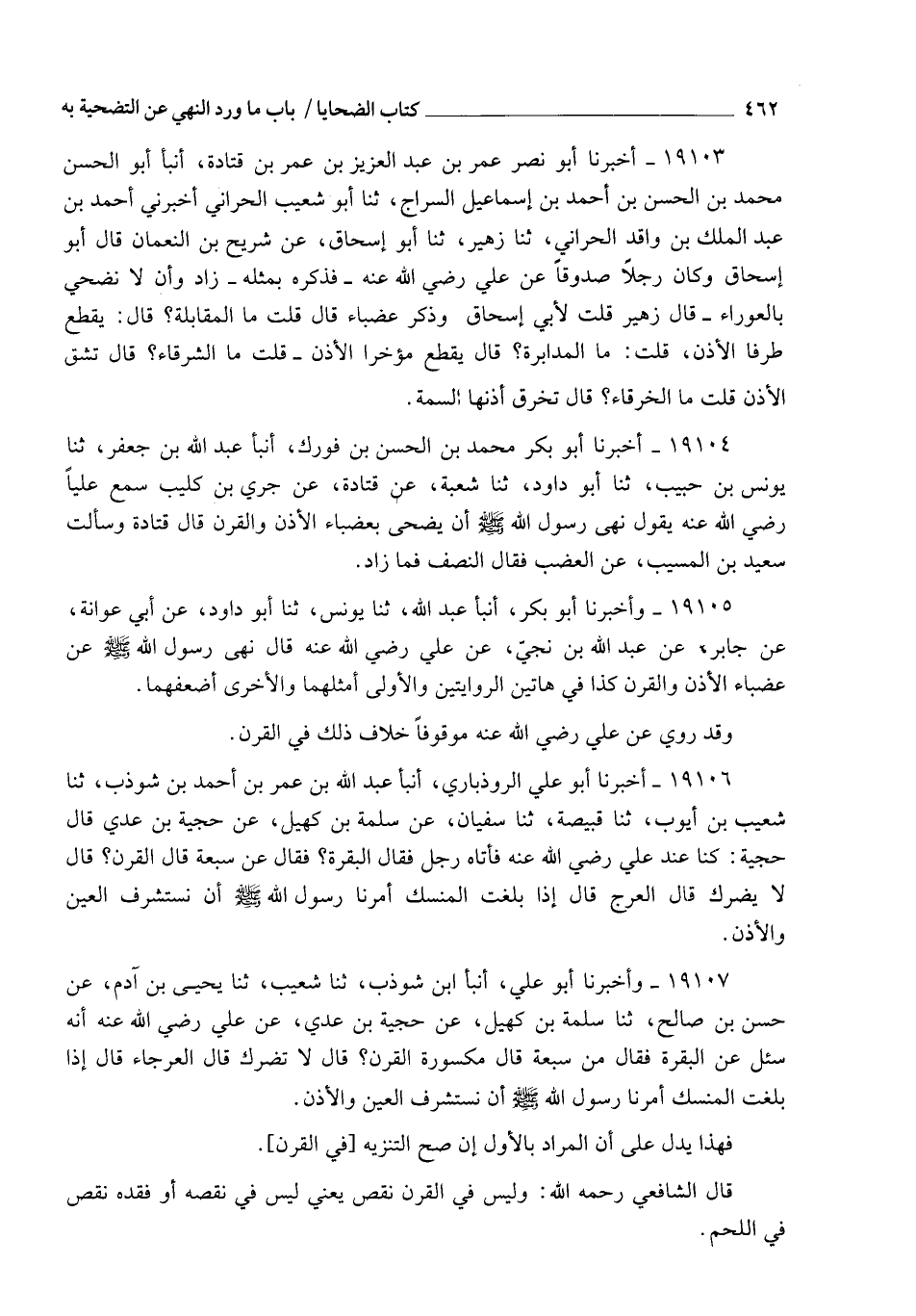 19107 - وَأَخْبَرَنَا أَبُو عَلِيٍّ، أنبأ ابْنُ شَوْذَبٍ، ثنا شُعَيْبٌ، ثنا يَحْيَى بْنُ آدَمَ، عَنْ حَسَنِ بْنِ صَالِحٍ، ثنا سَلَمَةُ بْنُ كُهَيْلٍ، عَنْ حُجَيَّةَ بْنِ عَدِيٍّ، عَنْ عَلِيٍّ رَضِيَ اللهُ عَنْهُ أَنَّهُ سُئِلَ عَنِ الْبَقَرَةِ، فَقَالَ: مِنْ سَبْعَةٍ. قَالَ: مَكْسُورَةُ الْقَرْنِ؟ قَالَ: لَا تَضُرُّكَ. قَالَ: الْعَرْجَاءُ؟ قَالَ: إِذَا بَلَغْتَ الْمَنْسَكَ §أَمَرَنَا رَسُولُ اللهِ صَلَّى اللهُ عَلَيْهِ وَسَلَّمَ أَنْ نَسْتَشْرِفَ الْعَيْنَ وَالْأُذُنَ. فَهَذَا يَدُلُّ عَلَى أَنَّ الْمُرَادَ بِالْأَوَّلِ إِنْ صَحَّ التَّنْزِيهُ فِي الْقَرْنِ قَالَ الشَّافِعِيُّ رَحِمَهُ اللهُ: وَلَيْسَ فِي الْقَرْنِ نَقْصٌ , يَعْنِي لَيْسَ فِي نَقْصِهِ أَوْ فَقْدِهِ نَقْصٌ فِي اللَّحْمِ