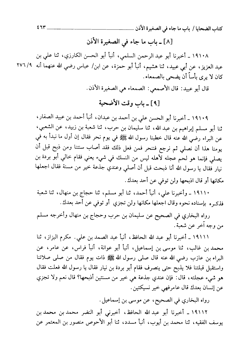 19108 - أَخْبَرَنَا أَبُو عَبْدِ الرَّحْمَنِ السُّلَمِيُّ، أنبأ أَبُو الْحَسَنِ الْكَارِزِيُّ، ثنا عَلِيُّ بْنُ عَبْدِ الْعَزِيزِ، عَنْ أَبِي عُبَيْدٍ، ثنا هُشَيْمٌ، أنبأ أَبُو حَمْزَةَ، عَنِ ابْنِ عَبَّاسٍ رَضِيَ اللهُ عَنْهُمَا أَنَّهُ كَانَ §لَا يَرَى بَأْسًا أَنْ يُضَحَّى بِالصَّمْعَاءِ. قَالَ أَبُو عُبَيْدٍ: قَالَ الْأَصْمَعِيُّ: الصَّمْعَاءُ هِيَ الصَّغِيرَةُ الْأُذُنِ