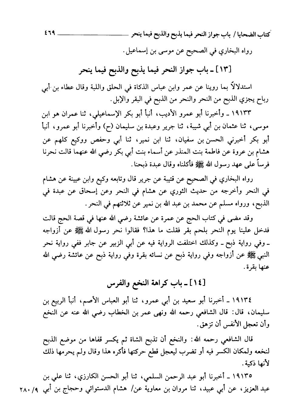 19133 - وَأَخْبَرَنَا أَبُو عَمْرٍو الْأَدِيبُ، أنبأ أَبُو بَكْرٍ الْإِسْمَاعِيلِيُّ، ثنا عِمْرَانُ هُوَ ابْنُ مُوسَى , ثنا عُثْمَانُ بْنُ أَبِي شَيْبَةَ، ثنا جَرِيرٌ، وَعَبْدَةُ بْنُ سُلَيْمَانَ، ح وَأَخْبَرَنَا أَبُو عَمْرٍو، أنبأ أَبُو بَكْرٍ، أَخْبَرَنِي الْحَسَنُ بْنُ سُفْيَانَ، ثنا ابْنُ نُمَيْرٍ، ثنا أَبِي وَحَفْصٌ، وَوَكِيعٌ، كُلُّهُمْ عَنْ هِشَامِ بْنِ عُرْوَةَ، عَنْ فَاطِمَةَ بِنْتِ الْمُنْذِرِ، عَنْ أَسْمَاءَ بِنْتِ أَبِي بَكْرٍ رَضِيَ اللهُ عَنْهُمَا قَالَتْ: §نَحَرْنَا فَرَسًا عَلَى عَهْدِ رَسُولِ اللهِ صَلَّى اللهُ عَلَيْهِ وَسَلَّمَ فَأَكَلْنَاهُ. وَقَالَ عَبْدَةُ: ذَبَحْنَا. رَوَاهُ الْبُخَارِيُّ فِي الصَّحِيحِ عَنْ قُتَيْبَةَ , عَنْ جَرِيرٍ، قَالَ: وَتَابَعَهُ وَكِيعٌ وَابْنُ عُيَيْنَةَ عَنْ هِشَامٍ فِي النَّحْرِ , وَأَخْرَجَهُ مِنْ حَدِيثِ الثَّوْرِيِّ عَنْ هِشَامٍ فِي النَّحْرِ , وَعَنْ إِسْحَاقَ عَنْ عَبْدَةَ فِي الذَّبْحِ. وَرَوَاهُ مُسْلِمٌ عَنْ مُحَمَّدِ بْنِ عَبْدِ اللهِ بْنِ نُمَيْرٍ عَنْ ثَلَاثَتِهِمْ فِي النَّحْرِ. وَقَدْ مَضَى فِي كِتَابِ الْحَجِّ عَنْ عَمْرَةَ عَنْ عَائِشَةَ رَضِيَ اللهُ عَنْهَا فِي قِصَّةِ الْحَجِّ قَالَتْ: فَدَخَلَ عَلَيْنَا يَوْمُ النَّحْرِ بِلَحْمِ بَقَرٍ فَقُلْتُ: مَا هَذَا؟ فَقَالُوا: نَحَرَ رَسُولُ اللهِ صَلَّى اللهُ عَلَيْهِ وَسَلَّمَ عَنْ أَزْوَاجِهِ , وَفِي رِوَايَةٍ ذَبَحَ , وَكَذَلِكَ اخْتَلَفَتِ الرِّوَايَةُ فِيهِ عَنْ أَبِي الزُّبَيْرِ عَنْ جَابِرٍ , فَفِي رِوَايَةٍ: نَحَرَ النَّبِيُّ صَلَّى اللهُ عَلَيْهِ وَسَلَّمَ عَنْ أَزْوَاجِهِ , وَفِي رِوَايَةٍ: ذَبَحَ عَنْ نِسَائِهِ بَقَرَةً , وَفِي رِوَايَةٍ: ذَبَحَ عَنْ عَائِشَةَ رَضِيَ اللهُ عَنْهَا بَقَرَةً