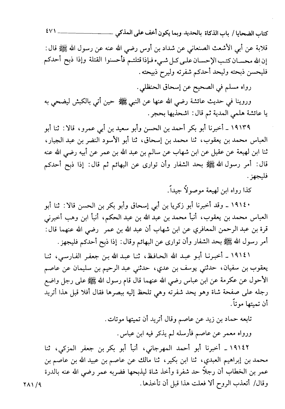 19139 - أَخْبَرَنَا أَبُو بَكْرٍ أَحْمَدُ بْنُ الْحَسَنِ , وَأَبُو سَعِيدِ بْنُ أَبِي عَمْرٍو قَالَا: ثنا أَبُو الْعَبَّاسِ مُحَمَّدُ بْنُ يَعْقُوبَ , ثنا مُحَمَّدُ بْنُ إِسْحَاقَ، ثنا أَبُو الْأَسْوَدِ النَّضْرُ بْنُ عَبْدِ الْجَبَّارِ، ثنا ابْنُ لَهِيعَةَ، عَنْ عُقَيْلٍ، عَنِ ابْنِ شِهَابٍ، عَنْ سَالِمِ بْنِ عَبْدِ اللهِ بْنِ عُمَرَ، عَنْ أَبِيهِ رَضِيَ اللهُ عَنْهُ قَالَ: أَمَرَ رَسُولُ اللهِ صَلَّى اللهُ عَلَيْهِ وَسَلَّمَ بِحَدِّ الشِّفَارِ , وَأَنْ تُوَارَى عَنِ الْبَهَائِمِ , ثُمَّ قَالَ: §" إِذَا ذَبَحَ أَحَدُكُمْ فَلْيُجْهِزْ ". كَذَا رَوَاهُ ابْنُ لَهِيعَةَ مَوْصُولًا جَيِّدًا