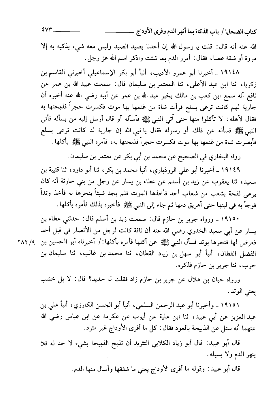 19151 - وَأَخْبَرَنَا أَبُو عَبْدِ الرَّحْمَنِ السُّلَمِيُّ، أنبأ أَبُو الْحَسَنِ الْكَارِزِيُّ، أنبأ عَلِيُّ بْنُ عَبْدِ الْعَزِيزِ، عَنْ أَبِي عُبَيْدٍ، ثنا ابْنُ عُلَيَّةَ، عَنْ أَيُّوبَ، عَنْ عِكْرِمَةَ، عَنِ ابْنِ عَبَّاسٍ رَضِيَ اللهُ عَنْهُمَا , أَنَّهُ سُئِلَ عَنِ الذَّبِيحَةِ بِالْعُودِ , فَقَالَ: §كُلُّ مَا أَفْرَى الْأَوْدَاجَ غَيْرَ مُثَرِّدٍ. قَالَ أَبُو عُبَيْدٍ: قَالَ أَبُو زِيَادٍ الْكِلَابِيُّ: التَّثْرِيدُ: أَنْ تُذْبَحَ الذَّبِيحَةُ بِشَيْءٍ لَا حَدَّ لَهُ فَلَا يُنْهِرَ الدَّمَ وَلَا يُسِيلُهُ. قَالَ أَبُو عُبَيْدٍ: وَقَوْلُهُ: مَا أَفْرَى الْأَوْدَاجَ يَعْنِي: مَا شَقَّقَهَا وَأَسَالَ مِنْهَا الدَّمَ. -[474]- قَالَ أَبُو عُبَيْدٍ: وَقَدْ تَأَوَّلَ بَعْضُ النَّاسِ هَذَا الْحَدِيثَ أَنَّ قَوْلَهُ: كُلْ مِنَ الْأَكْلِ , وَهَذَا خَطَأٌ وَلَوْ أَرَادَ مِنَ الْأَكْلِ لَوَقَعَ الْمَعْنَى عَلَى الشَّفْرَةِ؛ لِأَنَّ الشَّفْرَةَ هِيَ الَّتِي تُفْرِي , وَإِنَّمَا مَعْنَى الْحَدِيثِ أَنَّ كُلَّ شَيْءٍ أَفْرَى الْأَوْدَاجَ مِنْ عُودٍ أَوْ حَجَرٍ بَعْدَ أَنْ يُفْرِيَهَا فَهُوَ ذَكِيٌّ