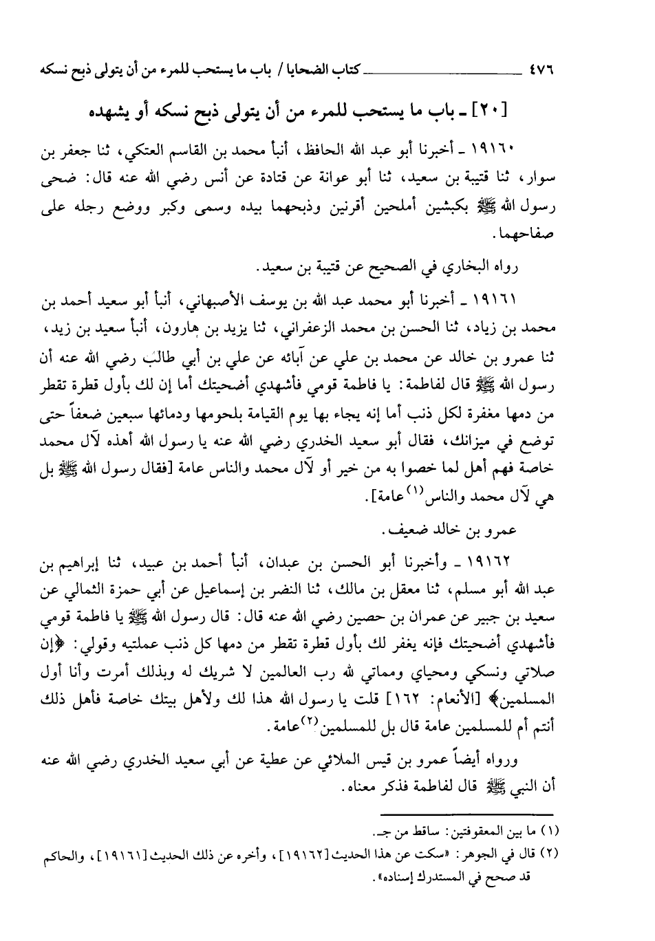 19162 - وَأَخْبَرَنَا أَبُو الْحَسَنِ بْنُ عَبْدَانَ، أنبأ أَحْمَدُ بْنُ عُبَيْدٍ، ثنا إِبْرَاهِيمُ بْنُ عَبْدِ اللهِ أَبُو مُسْلِمٍ، ثنا مَعْقِلُ بْنُ مَالِكٍ، ثنا النَّضْرُ بْنُ إِسْمَاعِيلَ، عَنْ أَبِي حَمْزَةَ الثُّمَالِيِّ، عَنْ سَعِيدِ بْنِ جُبَيْرٍ، عَنْ عِمْرَانَ بْنِ حُصَيْنٍ رَضِيَ اللهُ عَنْهُ قَالَ: قَالَ رَسُولُ اللهِ صَلَّى اللهُ عَلَيْهِ وَسَلَّمَ: " يَا فَاطِمَةُ §قُومِي فَاشْهَدِي أُضْحِيَّتَكِ فَإِنَّهُ يُغْفَرُ لَكِ بِأَوَّلِ قَطْرَةٍ تَقْطُرُ مِنْ دَمِهَا كُلُّ ذَنْبٍ عَمِلْتِيهِ , وَقُولِي: {إِنَّ صَلَاتِي وَنُسُكِي وَمَحْيَايَ وَمَمَاتِي لِلَّهِ رَبِّ الْعَالَمِينَ لَا شَرِيكَ لَهُ وَبِذَلِكَ أُمِرْتُ وَأَنَا أَوَّلُ الْمُسْلِمِينَ} [الأنعام: 163]. قُلْتُ: يَا رَسُولَ اللهِ هَذَا لَكَ وَلِأَهْلِ بَيْتِكَ خَاصَّةً، فَأَهْلُ ذَلِكَ أَنْتُمْ , أَمْ لِلِمُسْلِمِينَ عَامَّةً؟ قَالَ: " بَلْ لِلْمُسْلِمِينَ عَامَّةً ". وَرَوَاهُ أَيْضًا عَمْرُو بْنُ قَيْسٍ الْمُلَائِيُّ , عَنْ عَطِيَّةَ , عَنْ أَبِي سَعِيدٍ الْخُدْرِيِّ رَضِيَ اللهُ عَنْهُ أَنَّ النَّبِيَّ صَلَّى اللهُ عَلَيْهِ وَسَلَّمَ قَالَ لِفَاطِمَةَ , فَذَكَرَ مَعْنَاهُ , -[477]- وَيُذْكَرُ عَنْ أَبِي مُوسَى رَضِيَ اللهُ عَنْهُ أَنَّهُ أَمَرَ بَنَاتِهِ أَنْ يُضَحِّينَ بِأَيْدِيهِنَّ