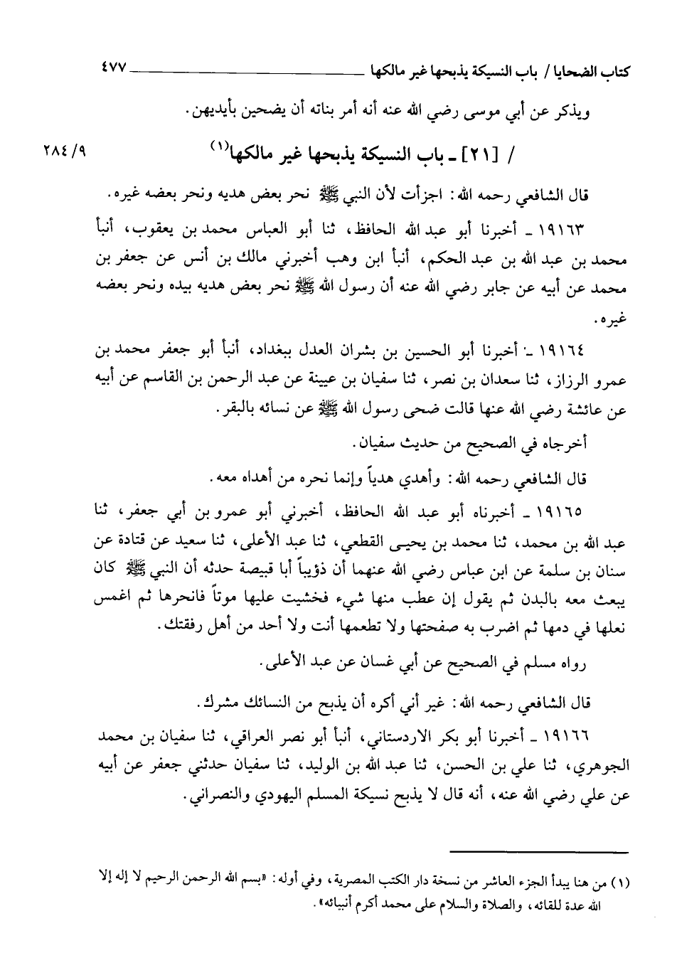 19164 - أَخْبَرَنَا أَبُو الْحُسَيْنِ بْنُ بِشْرَانَ الْعَدْلُ بِبَغْدَادَ , أنبأ أَبُو جَعْفَرٍ مُحَمَّدُ بْنُ عَمْرٍو الرَّزَّازُ , ثنا سَعْدَانُ بْنُ نَصْرٍ، ثنا سُفْيَانُ بْنُ عُيَيْنَةَ، عَنْ عَبْدِ الرَّحْمَنِ بْنِ الْقَاسِمِ، عَنْ أَبِيهِ، عَنْ عَائِشَةَ رَضِيَ اللهُ عَنْهَا قَالَتْ: §ضَحَّى رَسُولُ اللهِ صَلَّى اللهُ عَلَيْهِ وَسَلَّمَ عَنْ نِسَائِهِ بِالْبَقَرِ. أَخْرَجَاهُ فِي الصَّحِيحِ مِنْ حَدِيثِ سُفْيَانَ قَالَ الشَّافِعِيُّ رَحِمَهُ اللهُ: وَأُهْدِيَ هَدْيًا وَإِنَّمَا نَحَرَهُ مَنْ أَهْدَاهُ مَعَهُ