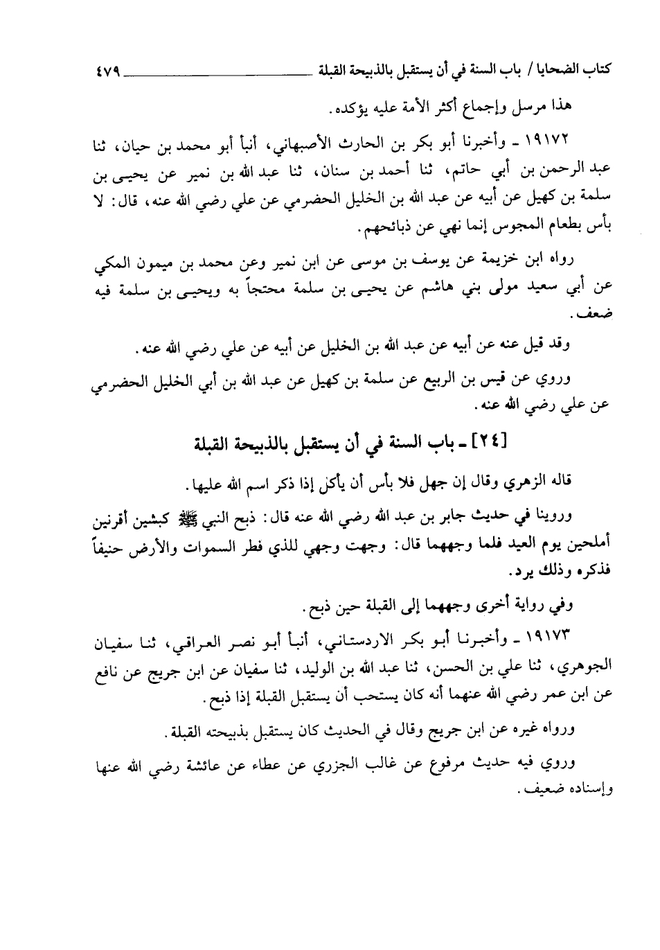 19173 - وَأَخْبَرَنَا أَبُو بَكْرٍ الْأَرْدَسْتَانِيُّ، أنبأ أَبُو نَصْرٍ الْعِرَاقِيُّ، ثنا سُفْيَانُ الْجَوْهَرِيُّ، ثنا عَلِيُّ بْنُ الْحَسَنِ، ثنا عَبْدُ اللهِ بْنُ الْوَلِيدِ، ثنا سُفْيَانُ، عَنِ ابْنِ جُرَيْجٍ، عَنْ نَافِعٍ، عَنِ ابْنِ عُمَرَ رَضِيَ اللهُ عَنْهُمَا أَنَّهُ §كَانَ يَسْتَحِبُّ أَنْ يَسْتَقْبِلَ الْقِبْلَةَ إِذَا ذَبَحَ. وَرَوَاهُ غَيْرُهُ عَنِ ابْنِ جُرَيْجٍ , وَقَالَ فِي الْحَدِيثِ: كَانَ يَسْتَقْبِلُ بِذَبِيحَتِهِ الْقِبْلَةَ , وَرُوِيَ فِيهِ حَدِيثٌ مَرْفُوعٌ عَنْ غَالِبٍ الْجَزَرِيِّ , عَنْ عَطَاءٍ , عَنْ عَائِشَةَ رَضِيَ اللهُ عَنْهَا. وَإِسْنَادُهُ ضَعِيفٌ