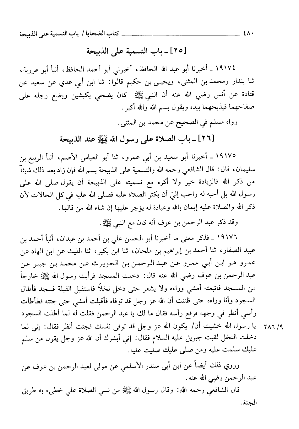 19175 - أَخْبَرَنَا أَبُو سَعِيدِ بْنُ أَبِي عَمْرٍو، ثنا أَبُو الْعَبَّاسِ الْأَصَمُّ، أَنْبَأَ الرَّبِيعُ بْنُ سُلَيْمَانَ، قَالَ: قَالَ الشَّافِعِيُّ رَحِمَهُ اللهُ: وَالتَّسْمِيَةُ عَلَى الذَّبِيحَةِ: بِسْمِ اللهِ , فَإِنْ زَادَ بَعْدَ ذَلِكَ شَيْئًا مِنْ ذِكْرِ اللهِ فَالزِّيَادَةُ خَيْرٌ , وَلَا أَكْرَهُ مَعَ تَسْمِيَتِهِ عَلَى الذَّبِيحَةِ أَنْ يَقُولَ صَلَّى الله عَلَى رَسُولِ اللهِ , بَلْ أُحِبُّهُ لَهُ وَأُحِبُّ إِلَيَّ أَنْ يُكْثِرَ الصَّلَاةَ عَلَيْهِ , فَصَلَّى الله عَلَيْهِ فِي كُلِّ الْحَالِاتِ؛ لِأَنَّ ذِكْرَ اللهِ وَالصَّلَاةَ عَلَيْهِ إِيمَانٌ بِاللهِ وَعِبَادَةٌ لَهُ يُؤْجَرُ عَلَيْهَا إِنْ شَاءَ اللهُ مَنْ قَالَهَا , وَقَدْ ذَكَرَ عَبْدُ الرَّحْمَنِ بْنُ عَوْفٍ أَنَّهُ كَانَ مَعَ النَّبِيِّ صَلَّى اللهُ عَلَيْهِ وَسَلَّمَ.