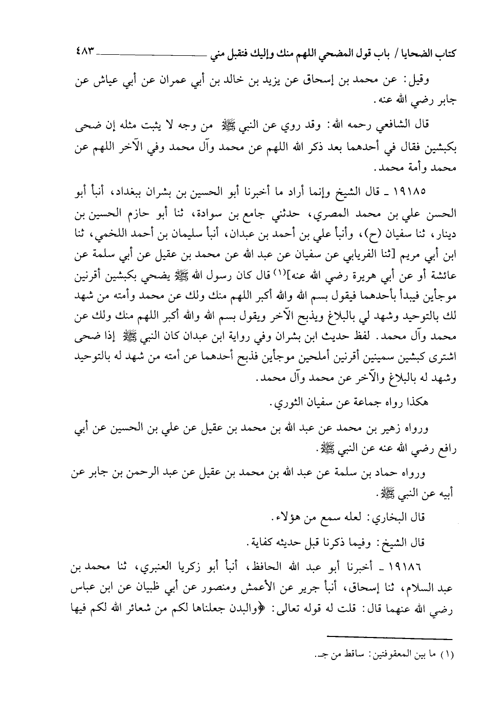 19185 - قَالَ الشَّيْخُ: وَإِنَّمَا أَرَادَ مَا أَخْبَرَنَا أَبُو الْحُسَيْنِ بْنُ بِشْرَانَ بِبَغْدَادَ , أنبأ أَبُو الْحَسَنِ عَلِيُّ بْنُ مُحَمَّدٍ الْمِصْرِيُّ , حَدَّثَنِي جَامِعُ بْنُ سَوَادَةَ، ثنا أَبُو حَازِمٍ الْحُسَيْنُ بْنُ دِينَارٍ، ثنا سُفْيَانُ، ح وأنبأ عَلِيُّ بْنُ أَحْمَدَ بْنِ عَبْدَانَ، أنبأ سُلَيْمَانُ بْنُ أَحْمَدَ اللَّخْمِيُّ، ثنا ابْنُ أَبِي مَرْيَمَ، ثنا الْفِرْيَابِيُّ، عَنْ سُفْيَانَ، عَنْ عَبْدِ اللهِ، عَنْ مُحَمَّدِ بْنِ عَقِيلٍ، عَنْ أَبِي سَلَمَةَ، عَنْ عَائِشَةَ، أَوْ عَنْ أَبِي هُرَيْرَةَ رَضِيَ اللهُ عَنْهُ قَالَ: كَانَ رَسُولُ اللهِ صَلَّى اللهُ عَلَيْهِ وَسَلَّمَ §يُضَحِّي بِكَبْشَيْنِ أَقْرَنَيْنِ مُوجَأَيْنِ , فَيَبْدَأُ بِأَحَدِهِمَا فَيَقُولُ: " بِسْمِ اللهِ وَاللهُ أَكْبَرُ , اللهُمَّ مِنْكَ وَلَكَ عَنْ مُحَمَّدٍ وَأُمَّتِهِ مَنْ شَهِدَ لَكَ بِالتَّوْحِيدِ وَشَهِدَ لِي بِالْبَلَاغِ " , وَيَذْبَحُ الْآخَرَ وَيَقُولُ: " بِسْمِ اللهِ وَاللهُ أَكْبَرُ , اللهُمَّ مِنْكَ وَلَكَ عَنْ مُحَمَّدٍ وَآلِ مُحَمَّدٍ ". لَفْظُ حَدِيثِ ابْنِ بِشْرَانَ , وَفِي رِوَايَةِ ابْنِ عَبْدَانَ: كَانَ النَّبِيُّ صَلَّى اللهُ عَلَيْهِ وَسَلَّمَ إِذَا ضَحَّى اشْتَرَى كَبْشَيْنِ سَمِينَيْنِ أَقْرَنَيْنِ أَمْلَحَيْنِ مُوجَأَيْنِ , فَذَبَحَ أَحَدَهُمَا عَنْ أُمَّتِهِ مَنْ شَهِدَ لَهُ بِالتَّوْحِيدِ وَشَهِدَ لَهُ بِالْبَلَاغِ , وَالْآخَرَ عَنْ مُحَمَّدٍ وَآلِ مُحَمَّدٍ. هَكَذَا رَوَاهُ جَمَاعَةٌ عَنْ سُفْيَانَ الثَّوْرِيِّ , وَرَوَاهُ زُهَيْرُ بْنُ مُحَمَّدٍ عَنْ عَبْدِ اللهِ بْنِ مُحَمَّدِ بْنِ عَقِيلٍ , عَنْ عَلِيِّ بْنِ الْحُسَيْنِ , عَنْ أَبِي رَافِعٍ رَضِيَ اللهُ عَنْهُ , عَنِ النَّبِيِّ صَلَّى اللهُ عَلَيْهِ وَسَلَّمَ , وَرَوَاهُ حَمَّادُ بْنُ سَلَمَةَ , عَنْ عَبْدِ اللهِ بْنِ مُحَمَّدِ بْنِ عَقِيلٍ , عَنْ عَبْدِ الرَّحْمَنِ بْنِ جَابِرٍ , عَنْ أَبِيهِ , عَنِ النَّبِيِّ صَلَّى اللهُ عَلَيْهِ وَسَلَّمَ. قَالَ الْبُخَارِيُّ: لَعَلَّهُ سَمِعَ مِنْ هَؤُلَاءِ. قَالَ الشَّيْخُ: وَفِيمَا ذَكَرْنَا قَبْلَ حَدِيثِهِ كِفَايَةٌ