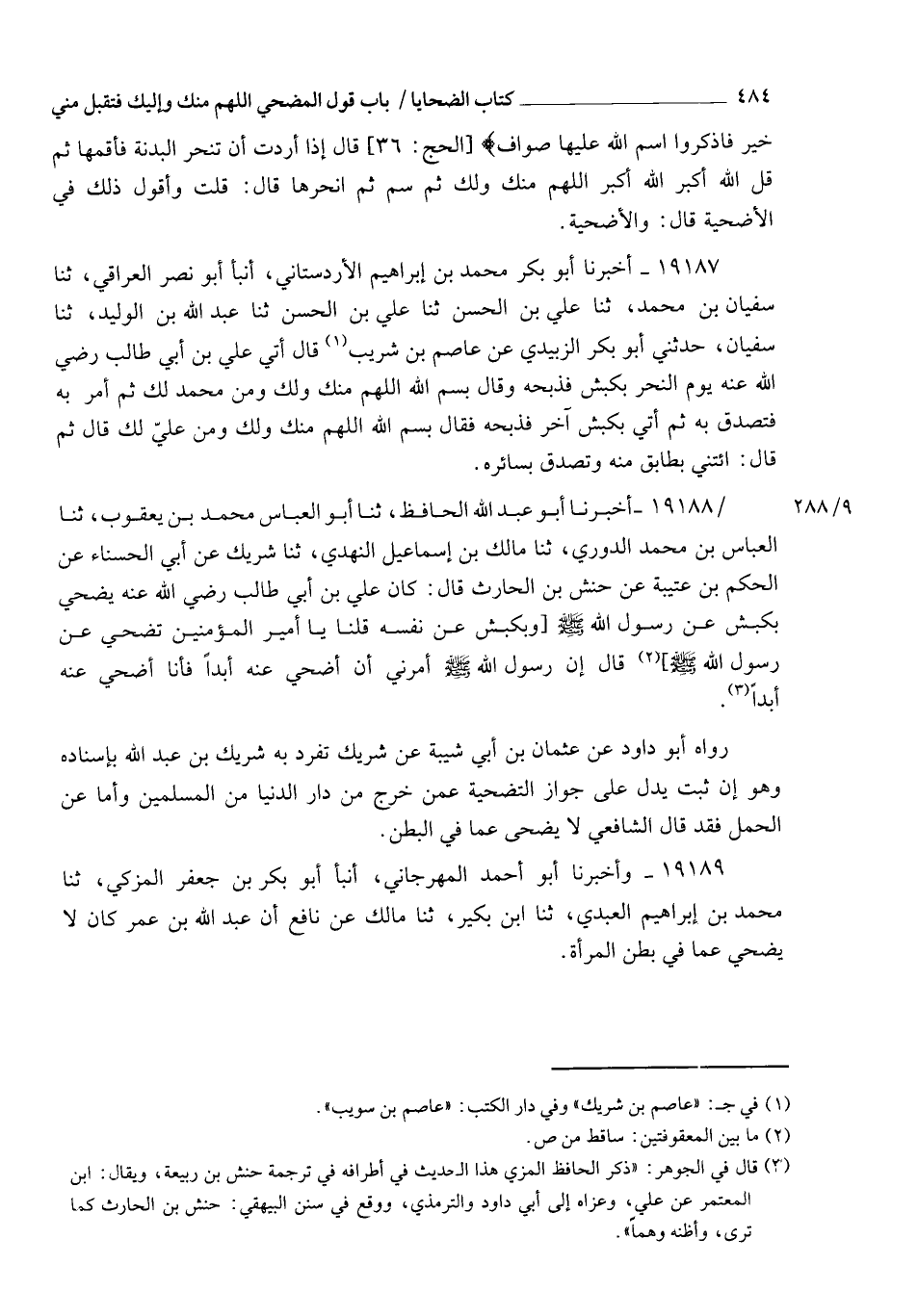 19188 - أَخْبَرَنَا أَبُو عَبْدِ اللهِ الْحَافِظُ، ثنا أَبُو الْعَبَّاسِ مُحَمَّدُ بْنُ يَعْقُوبَ , ثنا الْعَبَّاسُ بْنُ مُحَمَّدٍ الدُّورِيُّ، ثنا مَالِكُ بْنُ إِسْمَاعِيلَ النَّهْدِيُّ، ثنا شَرِيكٌ، عَنْ أَبِي الْحَسْنَاءِ، عَنِ الْحَكَمِ بْنِ عُتَيْبَةَ، عَنْ حَنَشِ بْنِ الْحَارِثِ، قَالَ: كَانَ عَلِيُّ بْنُ أَبِي طَالِبٍ رَضِيَ اللهُ عَنْهُ يُضَحِّي بِكَبْشٍ عَنْ رَسُولِ اللهِ صَلَّى اللهُ عَلَيْهِ وَسَلَّمَ وَبِكَبْشٍ عَنْ نَفْسِهِ , قُلْنَا: يَا أَمِيرَ الْمُؤْمِنِينَ تُضَحِّي عَنْ رَسُولِ اللهِ صَلَّى اللهُ عَلَيْهِ وَسَلَّمَ؟ قَالَ: إِنَّ رَسُولَ اللهِ صَلَّى اللهُ عَلَيْهِ وَسَلَّمَ §أَمَرَنِي أَنْ أُضَحِّيَ عَنْهُ أَبَدًا؛ فَأَنَا أُضَحِّي عَنْهُ أَبَدًا. رَوَاهُ أَبُو دَاوُدَ عَنْ عُثْمَانَ بْنِ أَبِي شَيْبَةَ , عَنْ شَرِيكٍ , تَفَرَّدَ بِهِ شَرِيكُ بْنُ عَبْدِ اللهِ بِإِسْنَادِهِ وَهُوَ إِنْ ثَبَتَ يَدُلُّ عَلَى جَوَازِ التَّضْحِيَةِ عَمَّنْ خَرَجَ مِنْ دَارِ الدُّنْيَا مِنَ الْمُسْلِمِينَ , وَأَمَّا عَنِ الْحَمْلِ فَقَدْ قَالَ الشَّافِعِيُّ: لَا يُضَحَّى عَمَّا فِي الْبَطْنِ