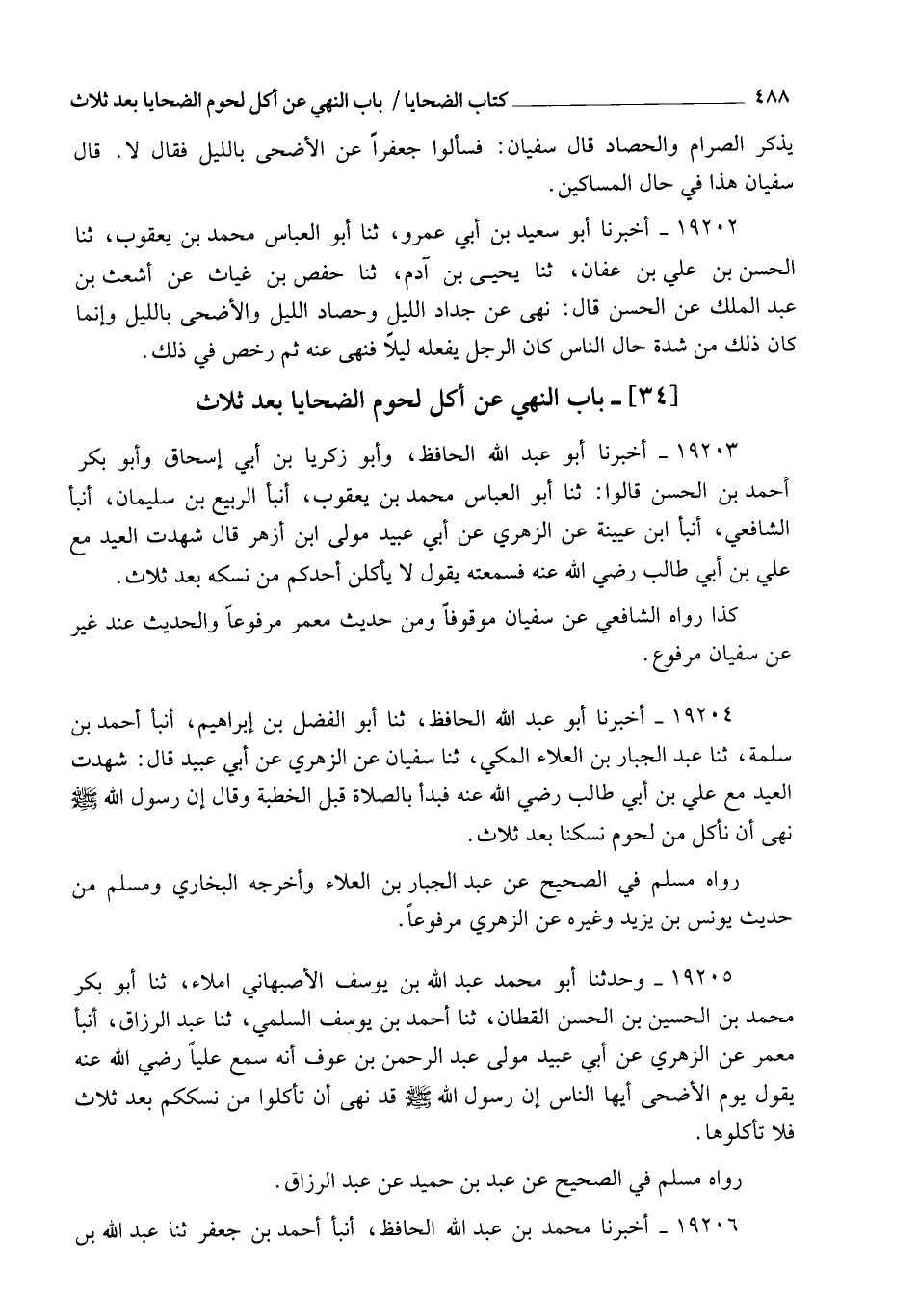 19205 - وَحَدَّثَنَا أَبُو مُحَمَّدٍ عَبْدُ اللهِ بْنُ يُوسُفَ الْأَصْبَهَانِيُّ إِمْلَاءً , ثنا أَبُو بَكْرٍ مُحَمَّدُ بْنُ الْحُسَيْنِ بْنِ الْحَسَنِ الْقَطَّانُ , ثنا أَحْمَدُ بْنُ يُوسُفَ السُّلَمِيُّ، ثنا عَبْدُ الرَّزَّاقِ، أنبأ مَعْمَرٌ، عَنِ الزُّهْرِيِّ، عَنْ أَبِي عُبَيْدٍ، مَوْلَى عَبْدِ الرَّحْمَنِ بْنِ عَوْفٍ أَنَّهُ سَمِعَ عَلِيًّا رَضِيَ اللهُ عَنْهُ يَقُولُ يَوْمَ الْأَضْحَى: أَيُّهَا النَّاسُ إِنَّ رَسُولَ اللهِ صَلَّى اللهُ عَلَيْهِ وَسَلَّمَ قَدْ §نَهَى أَنْ تَأْكُلُوا مِنْ نُسُكِكُمْ بَعْدَ ثَلَاثٍ فَلَا تَأْكُلُوهَا ". رَوَاهُ مُسْلِمٌ فِي الصَّحِيحِ عَنْ عَبْدِ بْنِ حُمَيْدٍ عَنْ عَبْدِ الرَّزَّاقِ