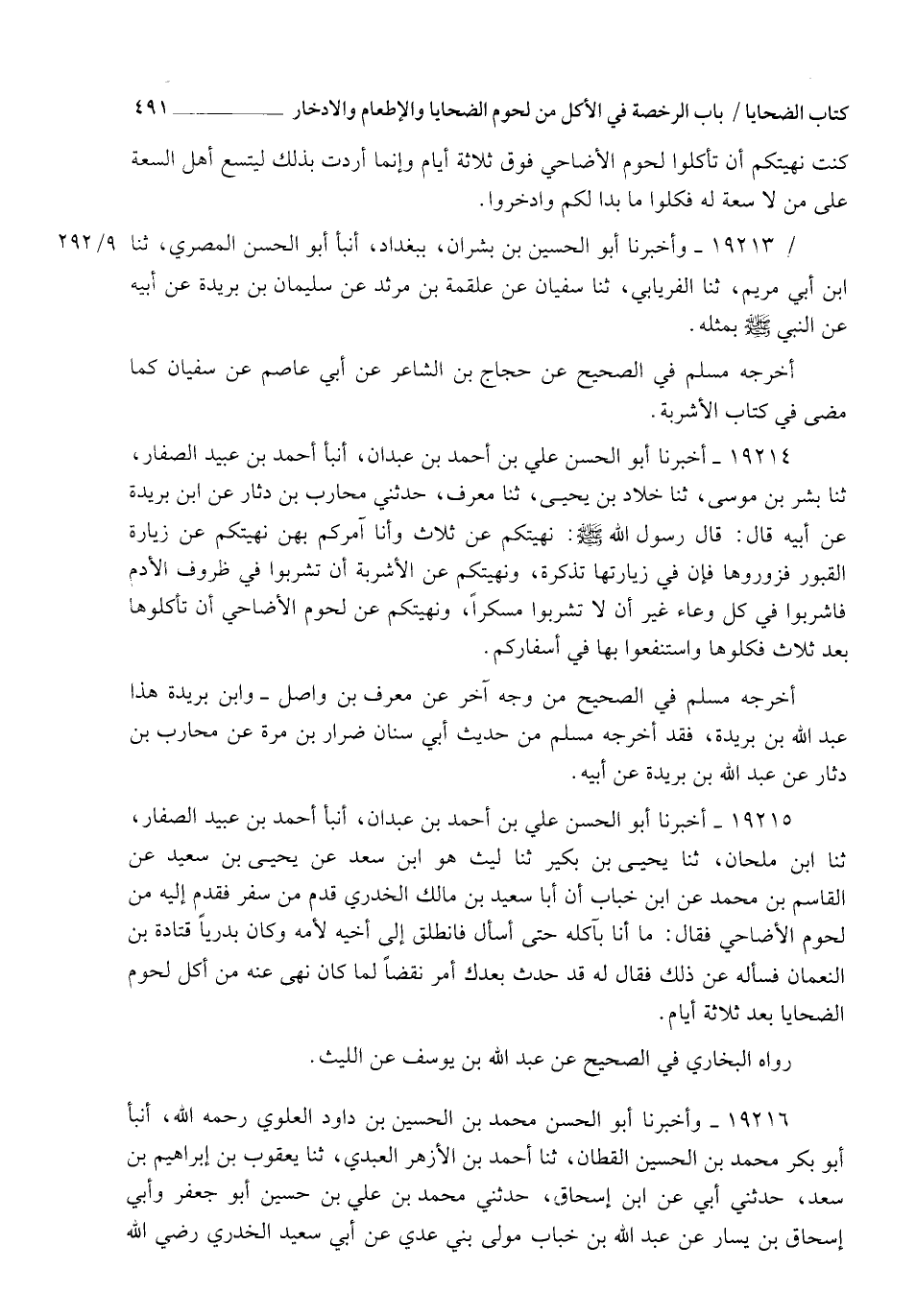 19216 - وَأَخْبَرَنَا أَبُو الْحَسَنِ مُحَمَّدُ بْنُ الْحُسَيْنِ بْنِ دَاوُدَ الْعَلَوِيُّ رَحِمَهُ اللهُ , أنبأ أَبُو بَكْرٍ مُحَمَّدُ بْنُ الْحُسَيْنِ الْقَطَّانُ , ثنا أَحْمَدُ بْنُ الْأَزْهَرِ الْعَبْدِيُّ، ثنا يَعْقُوبُ بْنُ إِبْرَاهِيمَ بْنِ سَعْدٍ، حَدَّثَنِي أَبِي، عَنِ ابْنِ إِسْحَاقَ، حَدَّثَنِي مُحَمَّدُ بْنُ عَلِيِّ بْنِ حُسَيْنٍ أَبُو جَعْفَرٍ، وَأَبِي إِسْحَاقُ بْنُ يَسَارٍ , عَنْ عَبْدِ اللهِ بْنِ خَبَّابٍ، مَوْلَى بَنِي عَدِيٍّ , عَنْ أَبِي سَعِيدٍ الْخُدْرِيِّ رَضِيَ اللهُ -[492]- عَنْهُ قَالَ: كَانَ رَسُولُ اللهِ صَلَّى اللهُ عَلَيْهِ وَسَلَّمَ قَدْ §نَهَانَا أَنْ نَأْكُلَ لُحُومَ نُسُكِنَا فَوْقَ ثَلَاثٍ , فَخَرَجْتُ فِي سَفَرٍ ثُمَّ قَدِمْتُ عَلَى أَهْلِي فَقَالَتْ: إِنَّهُ رَخَّصَ لِلنَّاسِ بَعْدَ ذَلِكَ. قَالَ: فَلَمْ أُصَدِّقْهَا حَتَّى بَعَثْتُ إِلَى أَخِي قَتَادَةَ بْنِ النُّعْمَانِ وَكَانَ بَدْرِيًّا أَسْأَلُهُ عَنْ ذَلِكَ. قَالَ: فَبَعَثَ إِلِيَّ أَنْ كُلْ طَعَامَكَ فَقَدْ صَدَقَتْ , قَدْ أَرْخَصَ رَسُولُ اللهِ صَلَّى اللهُ عَلَيْهِ وَسَلَّمَ لِلْمُسْلِمِينَ فِي ذَلِكَ