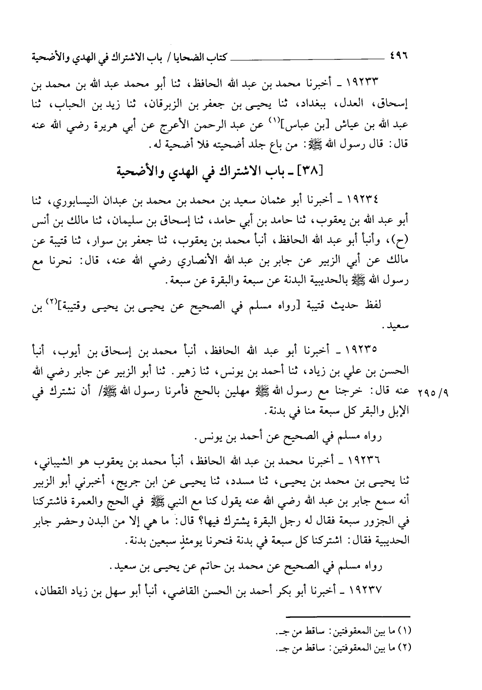 19234 - أَخْبَرَنَا أَبُو عُثْمَانَ سَعِيدُ بْنُ مُحَمَّدِ بْنِ مُحَمَّدِ بْنِ عَبْدَانَ النَّيْسَابُورِيُّ , ثنا أَبُو عَبْدِ اللهِ بْنُ يَعْقُوبَ، ثنا حَامِدُ بْنُ أَبِي حَامِدٍ، ثنا إِسْحَاقُ بْنُ سُلَيْمَانَ، ثنا مَالِكُ بْنُ أَنَسٍ، ح وأنبأ أَبُو عَبْدِ اللهِ الْحَافِظُ، أنبأ مُحَمَّدُ بْنُ يَعْقُوبَ، ثنا جَعْفَرُ بْنُ سَوَّارٍ، ثنا قُتَيْبَةُ، عَنْ مَالِكٍ، عَنْ أَبِي الزُّبَيْرِ، عَنْ جَابِرِ بْنِ عَبْدِ اللهِ الْأَنْصَارِيِّ رَضِيَ اللهُ عَنْهُ قَالَ: §نَحَرْنَا مَعَ رَسُولِ اللهِ صَلَّى اللهُ عَلَيْهِ وَسَلَّمَ بِالْحُدَيْبِيَةِ الْبَدَنَةَ عَنْ سَبْعَةٍ , وَالْبَقَرَةَ عَنْ سَبْعَةٍ لَفْظُ حَدِيثِ قُتَيْبَةَ. رَوَاهُ مُسْلِمٌ فِي الصَّحِيحِ عَنْ يَحْيَى بْنِ يَحْيَى وَقُتَيْبَةَ بْنِ سَعِيدٍ