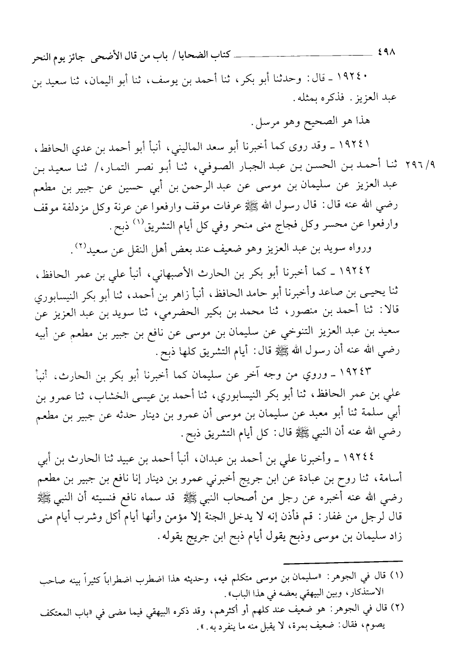 19242 - كَمَا أَخْبَرَنَا أَبُو بَكْرِ بْنُ الْحَارِثِ الْأَصْبَهَانِيُّ، أنبأ عَلِيُّ بْنُ عُمَرَ الْحَافِظُ، ثنا يَحْيَى بْنُ صَاعِدٍ، وَأَخْبَرَنَا أَبُو حَامِدٍ الْحَافِظُ، أنبأ زَاهِرُ بْنُ أَحْمَدَ، ثنا أَبُو بَكْرٍ النَّيْسَابُورِيُّ، قَالَا: ثنا أَحْمَدُ بْنُ مَنْصُورٍ، ثنا مُحَمَّدُ بْنُ بُكَيْرٍ الْحَضْرَمِيُّ، ثنا سُوَيْدُ بْنُ عَبْدِ الْعَزِيزِ، عَنْ سَعِيدِ بْنِ عَبْدِ الْعَزِيزِ التَّنُوخِيِّ، عَنْ سُلَيْمَانَ بْنِ مُوسَى، عَنْ نَافِعِ بْنِ جُبَيْرِ بْنِ مُطْعِمٍ، عَنْ أَبِيهِ رَضِيَ اللهُ عَنْهُ أَنَّ رَسُولَ اللهِ صَلَّى اللهُ عَلَيْهِ وَسَلَّمَ قَالَ: §" أَيَّامُ التَّشْرِيقِ كُلُّهَا ذَبْحٌ