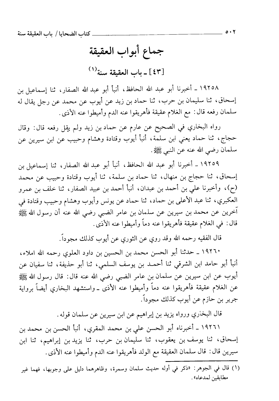 19259 - أَخْبَرَنَا أَبُو عَبْدِ اللهِ الْحَافِظُ، أنبأ أَبُو عَبْدِ اللهِ الصَّفَّارُ، ثنا إِسْمَاعِيلُ بْنُ إِسْحَاقَ، ثنا حَجَّاجُ بْنُ مِنْهَالٍ، ثنا حَمَّادُ بْنُ سَلَمَةَ، ثنا أَيُّوبُ، وَقَتَادَةُ، وَحَبِيبٌ، عَنْ مُحَمَّدٍ، ح وَأَخْبَرَنَا عَلِيُّ بْنُ أَحْمَدَ بْنِ عَبْدَانَ، أنبأ أَحْمَدُ بْنُ عُبَيْدٍ الصَّفَّارُ، ثنا خَلَفُ بْنُ عَمْرٍو الْعُكْبَرِيُّ، ثنا عَبْدُ الْأَعْلَى بْنُ حَمَّادٍ، ثنا حَمَّادٌ، عَنْ يُونُسَ، وَأَيُّوبَ، وَهِشَامٍ، وَحَبِيبٍ، وَقَتَادَةَ، فِي آخَرِينَ , عَنْ مُحَمَّدِ بْنِ سِيرِينَ , عَنْ سَلْمَانَ بْنِ عَامِرٍ الضَّبِّيِّ رَضِيَ اللهُ عَنْهُ أَنَّ رَسُولَ اللهِ صَلَّى اللهُ عَلَيْهِ وَسَلَّمَ قَالَ: §" فِي الْغُلَامِ عَقِيقَةٌ فَأَهْرِيقُوا عَنْهُ دَمًا وَأَمِيطُوا عَنْهُ الْأَذَى ". قَالَ الْفَقِيهُ رَحِمَهُ اللهُ: وَقَدْ رُوِيَ عَنِ الثَّوْرِيِّ , عَنْ أَيُّوبَ كَذَلِكَ مُجَوَّدًا