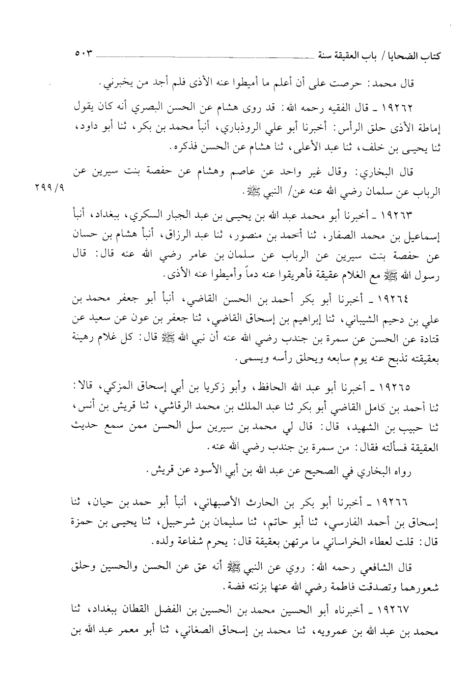 19265 - أَخْبَرَنَا أَبُو عَبْدِ اللهِ الْحَافِظُ، وَأَبُو زَكَرِيَّا بْنُ أَبِي إِسْحَاقَ الْمُزَكِّي قَالَا: ثنا أَحْمَدُ بْنُ كَامِلٍ الْقَاضِي أَبُو بَكْرٍ، ثنا عَبْدُ الْمَلِكِ بْنُ مُحَمَّدٍ الرَّقَاشِيُّ، ثنا قُرَيْشُ بْنُ أَنَسٍ، ثنا حَبِيبُ بْنُ الشَّهِيدِ، قَالَ: قَالَ لِي مُحَمَّدُ بْنُ سِيرِينَ: سَلِ الْحَسَنَ مِمَّنْ سَمِعَ حَدِيثَ الْعَقِيقَةِ؟ فَسَأَلْتُهُ فَقَالَ: مِنْ سَمُرَةَ بْنِ جُنْدُبٍ رَضِيَ اللهُ عَنْهُ. رَوَاهُ الْبُخَارِيُّ فِي الصَّحِيحِ عَنْ عَبْدِ اللهِ بْنِ أَبِي الْأَسْوَدِ عَنْ قُرَيْشٍ