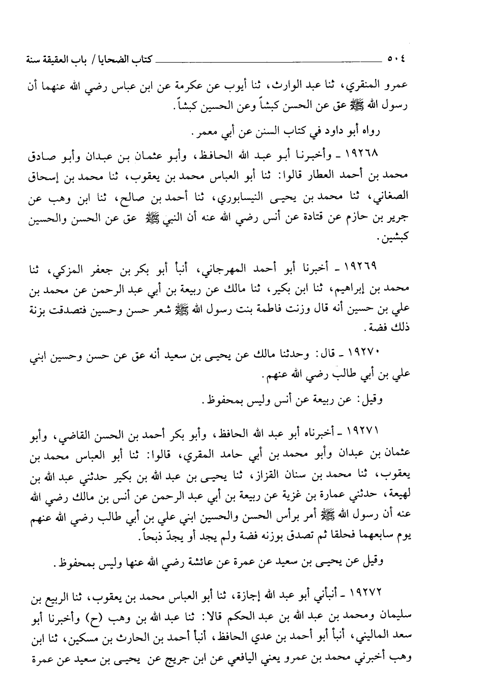 19271 - أَخْبَرَنَاهُ أَبُو عَبْدِ اللهِ الْحَافِظُ، وَأَبُو بَكْرٍ أَحْمَدُ بْنُ الْحَسَنِ الْقَاضِي , وَأَبُو عُثْمَانَ بْنُ عَبْدَانَ , وَأَبُو مُحَمَّدِ بْنُ أَبِي حَامِدٍ الْمُقْرِيُّ قَالُوا: ثنا أَبُو الْعَبَّاسِ مُحَمَّدُ بْنُ يَعْقُوبَ , ثنا مُحَمَّدُ بْنُ سِنَانٍ الْقَزَّازُ، ثنا يَحْيَى بْنُ عَبْدِ اللهِ بْنِ بُكَيْرٍ، حَدَّثَنِي عَبْدُ اللهِ بْنُ لَهِيعَةَ، حَدَّثَنِي عُمَارَةُ بْنُ غَزِيَّةَ، عَنْ رَبِيعَةَ بْنِ أَبِي عَبْدِ الرَّحْمَنِ، عَنْ أَنَسِ بْنِ مَالِكٍ رَضِيَ اللهُ عَنْهُ , أَنَّ رَسُولَ اللهِ صَلَّى اللهُ عَلَيْهِ وَسَلَّمَ §أَمَرَ بِرَأْسِ الْحَسَنِ وَالْحُسَيْنِ ابْنَيْ عَلِيِّ بْنِ أَبِي طَالِبٍ رَضِيَ اللهُ عَنْهُمْ يَوْمَ سَابِعِهِمَا فَحُلِقَا ثُمَّ تَصَدَّقَ بِوَزْنِهِ فِضَّةً وَلَمْ يَجِدْ أَوْ يَجُدَّ ذَبْحًا. وَقِيلَ عَنْ يَحْيَى بْنِ سَعِيدٍ , عَنْ عَمْرَةَ , عَنْ عَائِشَةَ رَضِيَ اللهُ عَنْهَا , وَلَيْسَ بِمَحْفُوظٍ