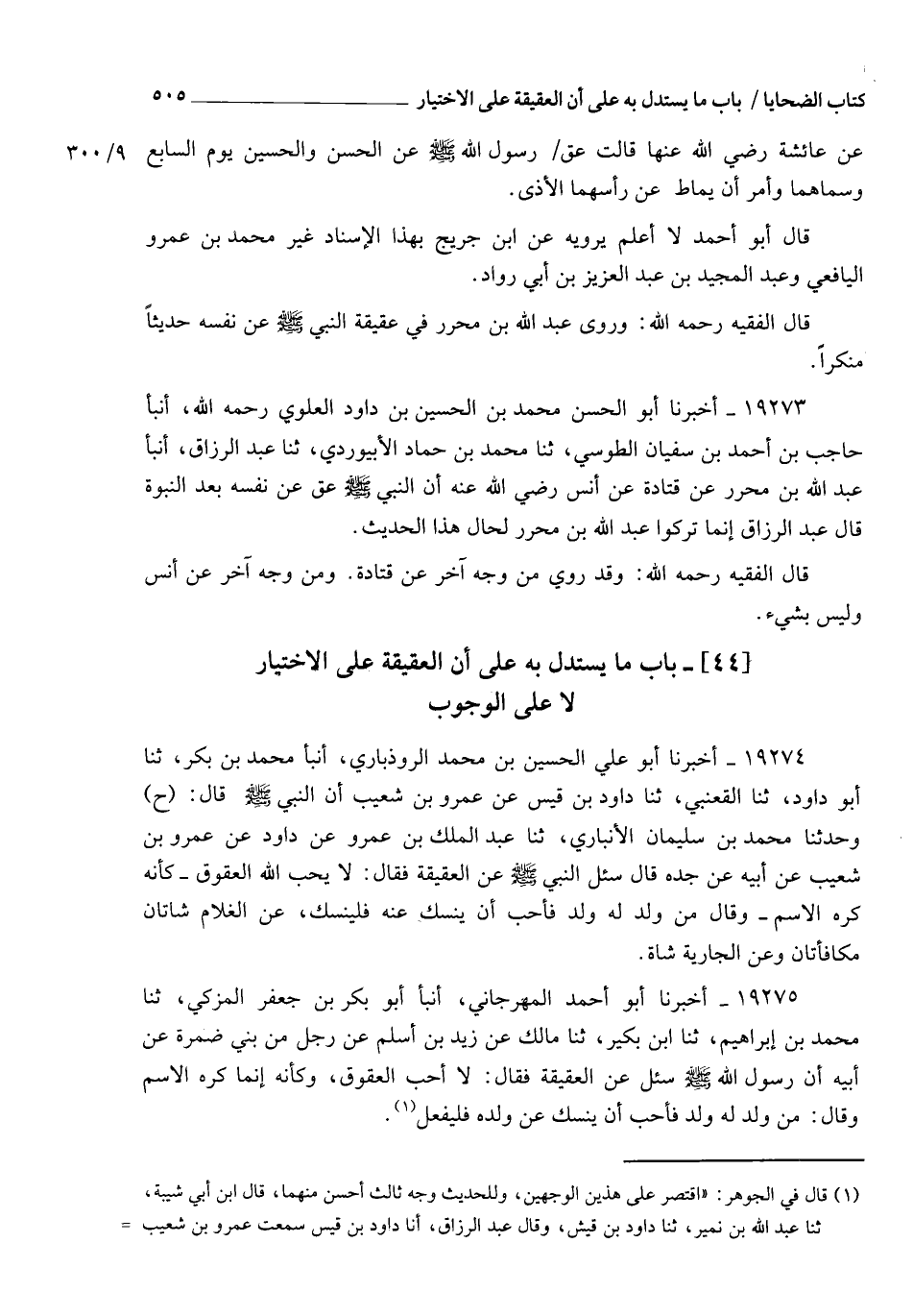 19273 - أَخْبَرَنَا أَبُو الْحَسَنِ مُحَمَّدُ بْنُ الْحُسَيْنِ بْنِ دَاوُدَ الْعَلَوِيُّ رَحِمَهُ اللهُ , أنبأ حَاجِبُ بْنُ أَحْمَدَ بْنِ سُفْيَانَ الطُّوسِيُّ، ثنا مُحَمَّدُ بْنُ حَمَّادٍ الْأَبْيُورْدِيُّ، ثنا عَبْدُ الرَّزَّاقِ، أنبأ عَبْدُ اللهِ بْنُ مُحَرَّرٍ، عَنْ قَتَادَةَ، عَنْ أَنَسٍ رَضِيَ اللهُ عَنْهُ , أَنَّ النَّبِيَّ صَلَّى اللهُ عَلَيْهِ وَسَلَّمَ §عَقَّ عَنْ نَفْسِهِ بَعْدَ النُّبُوَّةِ. قَالَ عَبْدُ الرَّزَّاقِ: إِنَّمَا تَرَكُوا عَبْدَ اللهِ بْنَ مُحَرَّرٍ لِحَالِ هَذَا الْحَدِيثِ. قَالَ الْفَقِيهُ رَحِمَهُ اللهُ: وَقَدْ رُوِيَ مِنْ وَجْهٍ آخَرَ عَنْ قَتَادَةَ , وَمِنْ وَجْهٍ آخَرَ عَنْ أَنَسٍ , وَلَيْسَ بِشَيْءٍ