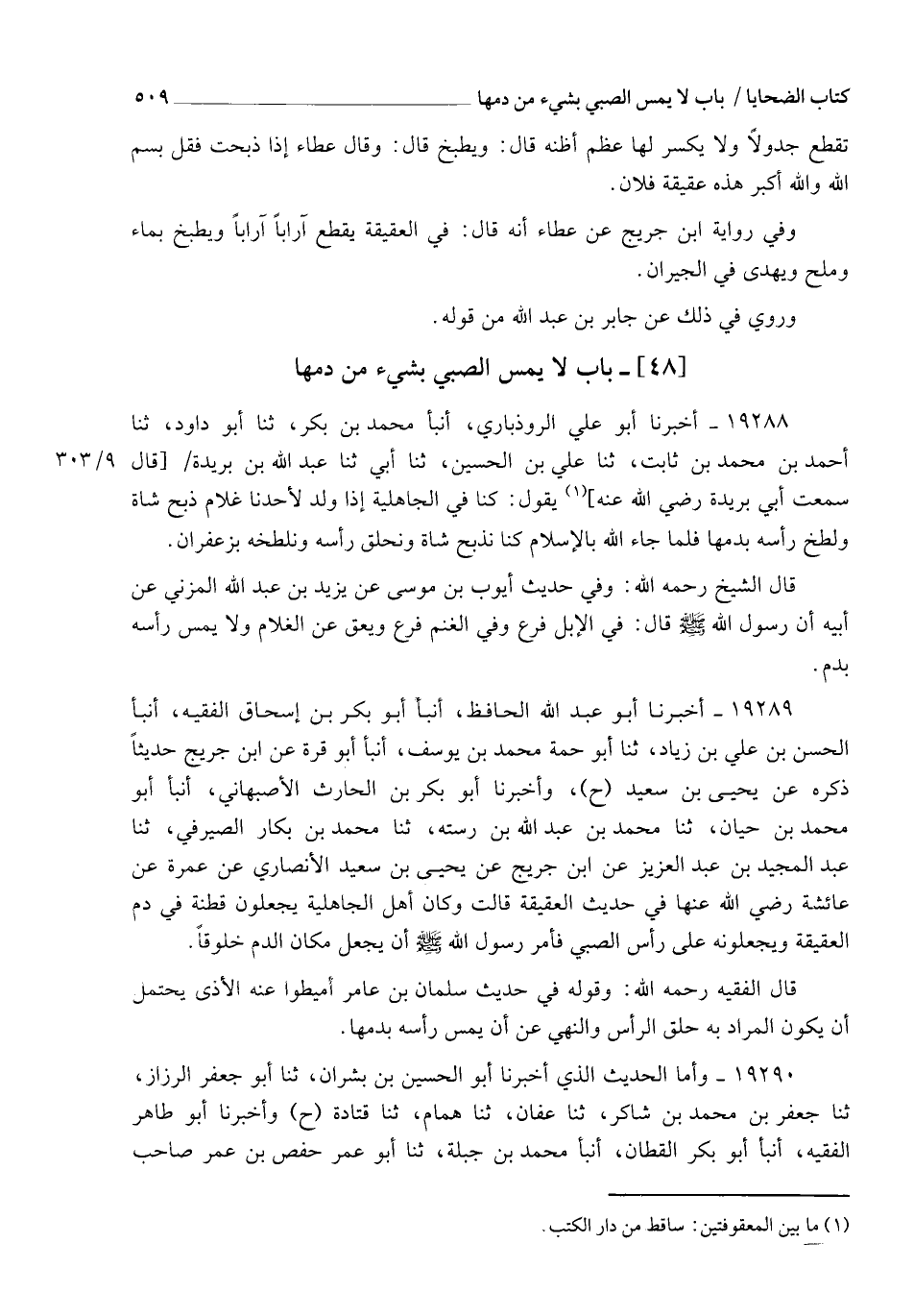 19289 - أَخْبَرَنَا أَبُو عَبْدِ اللهِ الْحَافِظُ، أنبأ أَبُو بَكْرِ بْنُ إِسْحَاقَ الْفَقِيهُ، أنبأ الْحَسَنُ بْنُ عَلِيِّ بْنِ زِيَادٍ، ثنا أَبُو حُمَةَ مُحَمَّدُ بْنُ يُوسُفَ , أنبأ أَبُو قُرَّةَ، عَنِ ابْنِ جُرَيْجٍ، حَدِيثًا ذَكَرَهُ عَنْ يَحْيَى بْنِ سَعِيدٍ، ح وَأَخْبَرَنَا أَبُو بَكْرِ بْنُ الْحَارِثِ الْأَصْبَهَانِيُّ، أنبأ أَبُو مُحَمَّدِ بْنُ حَيَّانَ، ثنا مُحَمَّدُ بْنُ عَبْدِ اللهِ بْنِ رُسْتَةَ، ثنا مُحَمَّدُ بْنُ بَكَّارٍ الصَّيْرَفِيُّ، ثنا عَبْدُ الْمَجِيدِ بْنُ عَبْدِ الْعَزِيزِ، عَنِ ابْنِ جُرَيْجٍ، عَنْ يَحْيَى بْنِ سَعِيدٍ الْأَنْصَارِيِّ، عَنْ عَمْرَةَ، عَنْ عَائِشَةَ رَضِيَ اللهُ عَنْهَا فِي حَدِيثِ الْعَقِيقَةِ قَالَتْ: §وَكَانَ أَهْلُ الْجَاهِلِيَّةِ يَجْعَلُونَ قُطْنَةً فِي دَمِ الْعَقِيقَةِ وَيَجْعَلُونَهُ عَلَى رَأْسِ الصَّبِيِّ , فَأَمَرَ رَسُولُ اللهِ صَلَّى اللهُ عَلَيْهِ وَسَلَّمَ أَنْ يُجْعَلَ مَكَانَ الدَّمِ خَلُوقٌ. قَالَ الْفَقِيهُ رَحِمَهُ اللهُ: وَقَوْلُهُ فِي حَدِيثِ سَلْمَانَ بْنِ عَامِرٍ: أَمِيطُوا عَنْهُ الْأَذَى , يُحْتَمَلُ أَنْ يَكُونَ الْمُرَادُ بِهِ حَلْقَ الرَّأْسِ , وَالنَّهْيَ عَنْ أَنْ يُمَسَّ رَأْسُهُ بِدَمِهَا