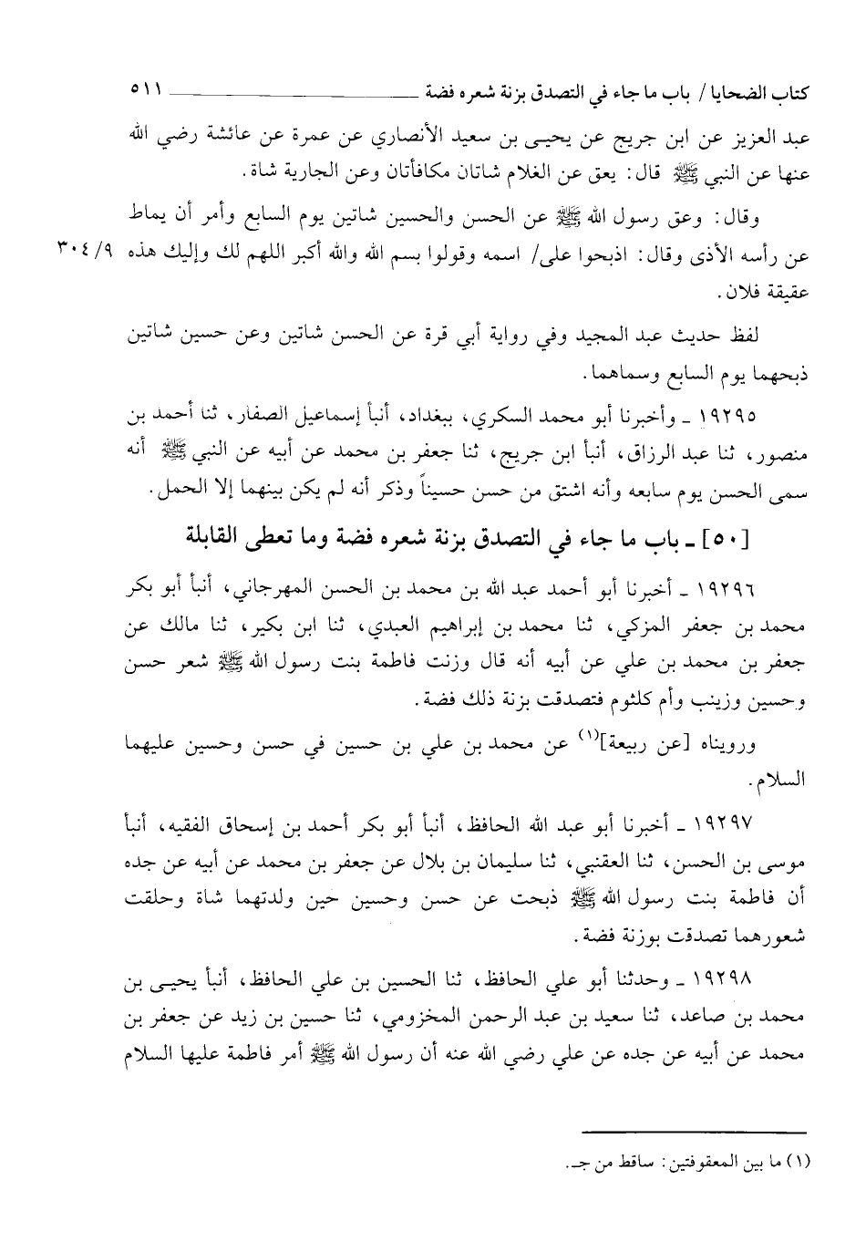 19296 - أَخْبَرَنَا أَبُو أَحْمَدَ عَبْدُ اللهِ بْنُ مُحَمَّدِ بْنِ الْحَسَنِ الْمِهْرَجَانِيُّ، أنبأ أَبُو بَكْرٍ مُحَمَّدُ بْنُ جَعْفَرٍ الْمُزَكِّي , ثنا مُحَمَّدُ بْنُ إِبْرَاهِيمَ الْعَبْدِيُّ، ثنا ابْنُ بُكَيْرٍ، ثنا مَالِكٌ، عَنْ جَعْفَرِ بْنِ مُحَمَّدِ بْنِ عَلِيٍّ، عَنْ أَبِيهِ، أَنَّهُ قَالَ: §وَزَنَتْ فَاطِمَةُ بِنْتُ رَسُولِ اللهِ صَلَّى اللهُ عَلَيْهِ وَسَلَّمَ شَعْرَ حَسَنٍ وَحُسَيْنٍ وَزَيْنَبَ وَأُمِّ كُلْثُومٍ , فَتَصَدَّقَتْ بِزِنَةِ ذَلِكَ فِضَّةً. وَرُوِّينَاهُ عَنْ رَبِيعَةَ عَنْ مُحَمَّدِ بْنِ عَلِيِّ بْنِ حُسَيْنٍ فِي حَسَنٍ وَحُسَيْنٍ عَلَيْهِمَا السَّلَامُ