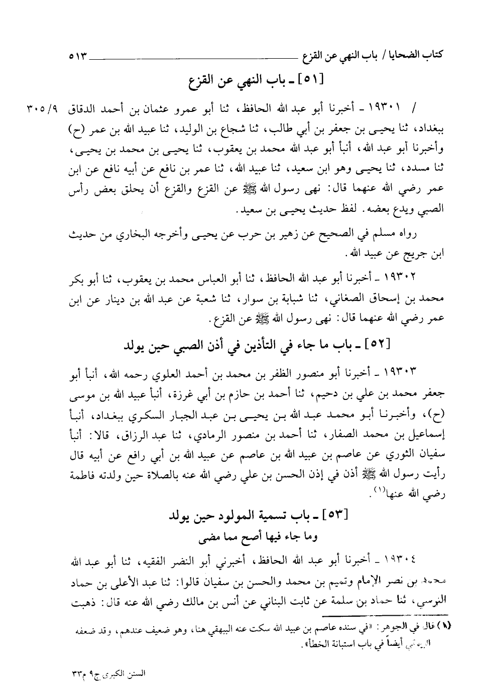 19303 - أَخْبَرَنَا أَبُو مَنْصُورٍ الظُّفُرُ بْنُ مُحَمَّدِ بْنِ أَحْمَدَ الْعَلَوِيُّ رَحِمَهُ اللهُ , أنبأ أَبُو جَعْفَرٍ مُحَمَّدُ بْنُ عَلِيِّ بْنِ دُحَيْمٍ , ثنا أَحْمَدُ بْنُ حَازِمِ بْنِ أَبِي غَرَزَةَ، أنبأ عُبَيْدُ اللهِ بْنُ مُوسَى، ح وَأَخْبَرَنَا أَبُو مُحَمَّدٍ عَبْدُ اللهِ بْنُ يَحْيَى بْنِ عَبْدِ الْجَبَّارِ السُّكَّرِيُّ بِبَغْدَادَ , أنبأ إِسْمَاعِيلُ بْنُ مُحَمَّدٍ الصَّفَّارُ، ثنا أَحْمَدُ بْنُ مَنْصُورٍ الرَّمَادِيُّ، ثنا عَبْدُ الرَّزَّاقِ، قَالَا: أنبأ سُفْيَانُ الثَّوْرِيُّ، عَنْ عَاصِمِ بْنِ عُبَيْدِ اللهِ بْنِ عَاصِمٍ، عَنْ عُبَيْدِ اللهِ بْنِ أَبِي رَافِعٍ، عَنْ أَبِيهِ، قَالَ: رَأَيْتُ رَسُولَ اللهِ صَلَّى اللهُ عَلَيْهِ وَسَلَّمَ §أَذَّنَ فِي أُذُنِ الْحَسَنِ بْنِ عَلِيٍّ رَضِيَ اللهُ عَنْهُ بِالصَّلَاةِ حِينَ وَلَدَتْهُ فَاطِمَةُ رَضِيَ اللهُ عَنْهَا