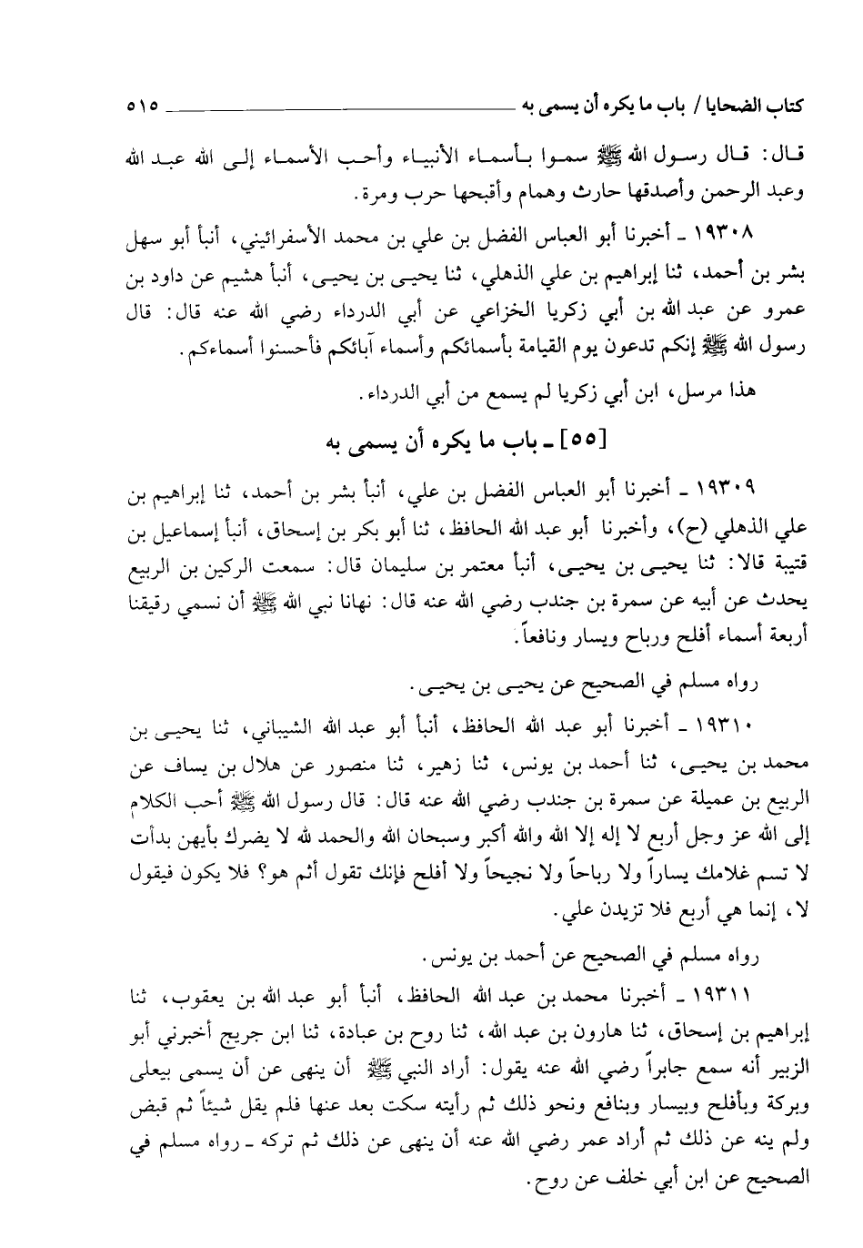 19309 - أَخْبَرَنَا أَبُو الْعَبَّاسِ الْفَضْلُ بْنُ عَلِيٍّ، أنبأ بِشْرُ بْنُ أَحْمَدَ، ثنا إِبْرَاهِيمُ بْنُ عَلِيٍّ الذُّهْلِيُّ، ح، وَأَخْبَرَنَا أَبُو عَبْدِ اللهِ الْحَافِظُ، ثنا أَبُو بَكْرِ بْنُ إِسْحَاقَ، أنبأ إِسْمَاعِيلُ بْنُ قُتَيْبَةَ، قَالَا: ثنا يَحْيَى بْنُ يَحْيَى، أنبأ مُعْتَمِرُ بْنُ سُلَيْمَانَ، قَالَ: سَمِعْتُ الرُّكَيْنَ بْنَ الرَّبِيعِ يُحَدِّثُ عَنْ أَبِيهِ، عَنْ سَمُرَةَ بْنِ جُنْدُبٍ رَضِيَ اللهُ عَنْهُ قَالَ: §نَهَانَا نَبِيُّ اللهِ صَلَّى اللهُ عَلَيْهِ وَسَلَّمَ أَنْ نُسَمِّيَ رَقِيقَنَا أَرْبَعَةَ أَسْمَاءٍ: أَفْلَحَ , وَرَبَاحًا , وَيَسَارًا , وَنَافِعًا ". رَوَاهُ مُسْلِمٌ فِي الصَّحِيحِ , عَنْ يَحْيَى بْنِ يَحْيَى