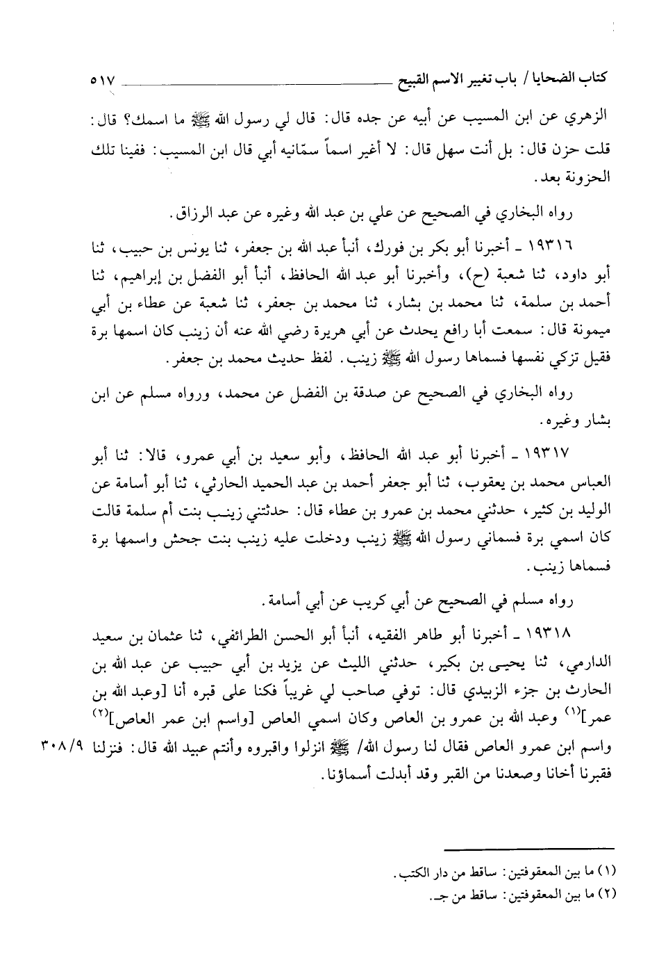 19318 - أَخْبَرَنَا أَبُو طَاهِرٍ الْفَقِيهُ، أنبأ أَبُو الْحَسَنِ الطَّرَائِفِيُّ، ثنا عُثْمَانُ بْنُ سَعِيدٍ الدَّارِمِيُّ، ثنا يَحْيَى بْنُ بُكَيْرٍ، حَدَّثَنِي اللَّيْثُ، عَنْ يَزِيدَ بْنِ أَبِي حَبِيبٍ، عَنْ عَبْدِ اللهِ بْنِ الْحَارِثِ بْنِ جَزْءٍ الزُّبَيْدِيِّ، قَالَ: تُوُفِّيَ صَاحِبٌ لِي غَرِيبًا فَكُنَّا عَلَى قَبْرِهِ أَنَا وَعَبْدُ اللهِ بْنُ عُمَرَ , وَعَبْدُ اللهِ بْنُ عَمْرِو بْنِ الْعَاصِ , وَكَانَ اسْمِي الْعَاصِ , وَاسْمُ ابْنِ عُمَرَ الْعَاصِ , وَاسْمُ ابْنِ عَمْرٍو الْعَاصِ , فَقَالَ لَنَا رَسُولُ اللهِ صَلَّى اللهُ عَلَيْهِ وَسَلَّمَ: " §انْزِلُوا وَاقْبُرُوهُ وَأَنْتُمْ عَبِيدُ اللهِ ". قَالَ: فَنَزَلْنَا فَقَبَرْنَا أَخَانَا وَصَعِدْنَا مِنَ الْقَبْرِ وَقَدْ أُبْدِلَتْ أَسْمَاؤُنَا -[518]- وَفِي هَذَا الْبَابِ أَخْبَارٌ كَثِيرَةٌ فَإِنَّهُ غَيَّرَ اسْمَ الْعَاصِ بْنِ الْأَسْوَدِ بِمُطِيعٍ , وَأَصْرَمَ بِزُرْعَةَ , وَشِهَابٍ بِهِشَامٍ , وَحَرْبٍ بِسِلْمٍ , وَالْمُضْطَجِعِ بِالْمُنْبَعِثِ , وَغَيْرِ ذَلِكَ مِمَّا يَطُولُ بِنَقْلِهِ الْكِتَابُ
