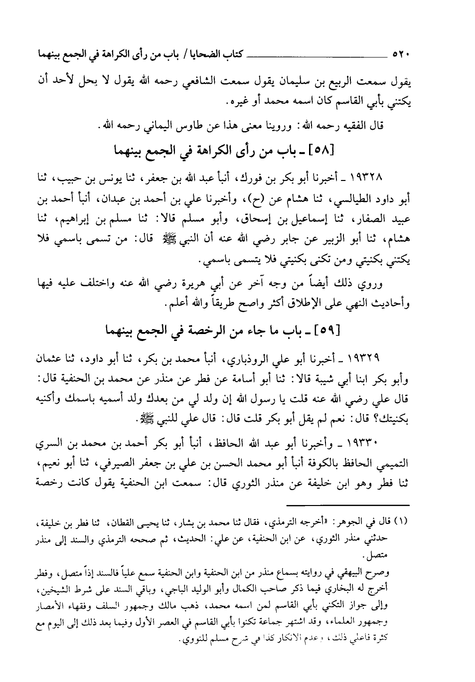 19328 - أَخْبَرَنَا أَبُو بَكْرِ بْنُ فُورَكٍ، أنبأ عَبْدُ اللهِ بْنُ جَعْفَرٍ، ثنا يُونُسُ بْنُ حَبِيبٍ، ثنا أَبُو دَاوُدَ الطَّيَالِسِيُّ، ثنا هِشَامٌ، عَنْ ح وَأَخْبَرَنَا عَلِيُّ بْنُ أَحْمَدَ بْنِ عَبْدَانَ، أنبا أَحْمَدُ بْنُ عُبَيْدٍ الصَّفَّارُ، ثنا إِسْمَاعِيلُ بْنُ إِسْحَاقَ، وَأَبُو مُسْلِمٍ، قَالَا: ثنا مُسْلِمُ بْنُ إِبْرَاهِيمَ، ثنا هِشَامٌ، ثنا أَبُو الزُّبَيْرِ، عَنْ جَابِرٍ رَضِيَ اللهُ عَنْهُ أَنَّ النَّبِيَّ صَلَّى اللهُ عَلَيْهِ وَسَلَّمَ قَالَ: §" مَنْ تَسَمَّى بِاسْمِي فَلَا يَكْتَنِي بِكُنْيَتِي , وَمَنْ تَكَنَّى بِكُنْيَتِي فَلَا يَتَسَمَّى بِاسْمِي ". وَرُوِيَ ذَلِكَ أَيْضًا مِنْ وَجْهٍ آخَرَ عَنْ أَبِي هُرَيْرَةَ رَضِيَ اللهُ عَنْهُ , وَاخْتُلِفَ عَلَيْهِ فِيهَا , وَأَحَادِيثُ النَّهْيِ عَلَى الْإِطْلَاقِ أَكْثَرُ وَأَصَحُّ طَرِيقًا وَاللهُ أَعْلَمُ
