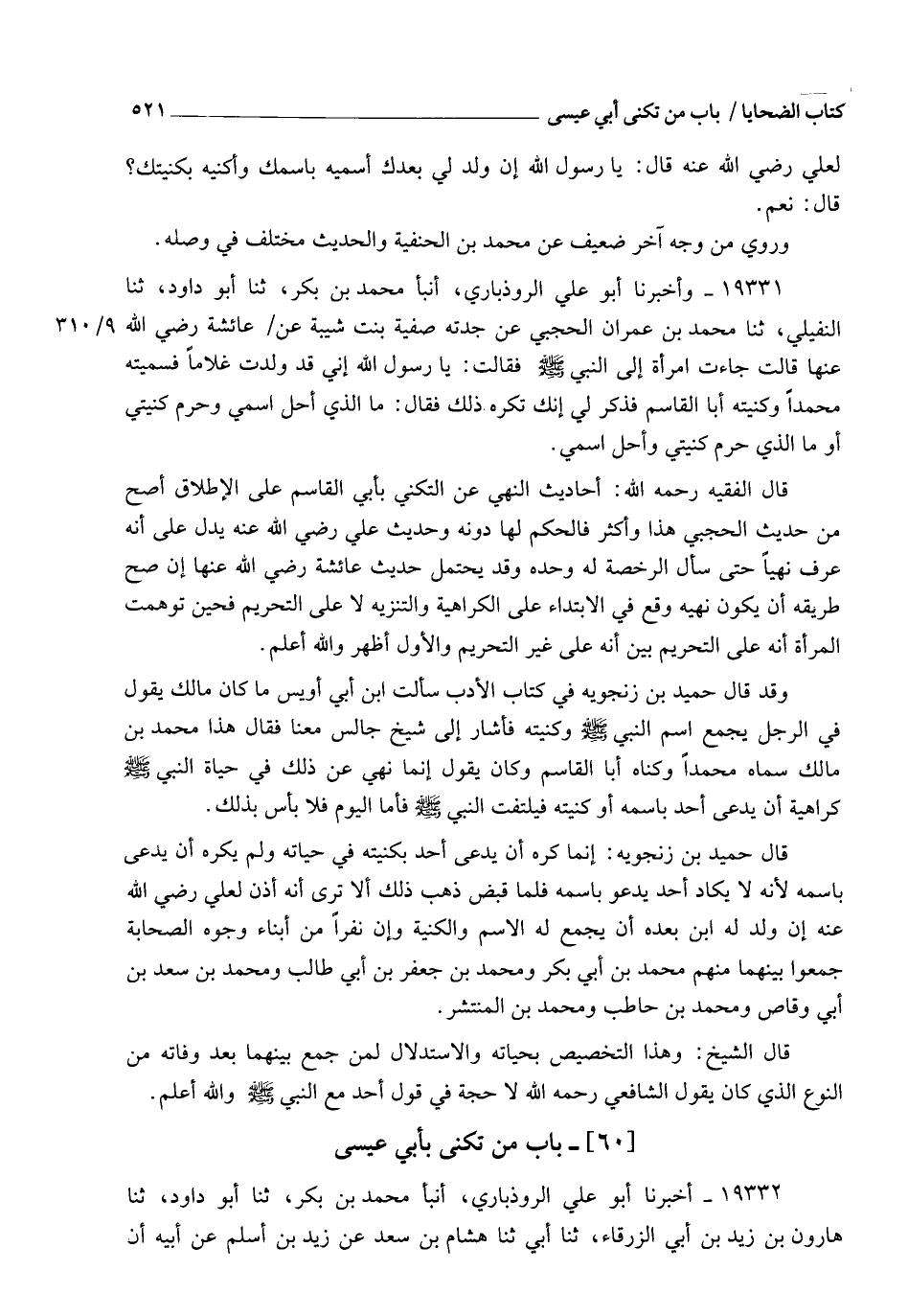 19331 - وَأَخْبَرَنَا أَبُو عَلِيٍّ الرُّوذْبَارِيُّ، أنبأ مُحَمَّدُ بْنُ بَكْرٍ، ثنا أَبُو دَاوُدَ، ثنا النُّفَيْلِيُّ، ثنا مُحَمَّدُ بْنُ عِمْرَانَ الْحَجَبِيُّ، عَنْ جَدَّتِهِ صَفِيَّةَ بِنْتِ شَيْبَةَ , عَنْ عَائِشَةَ رَضِيَ اللهُ عَنْهَا قَالَتْ: جَاءَتِ امْرَأَةٌ إِلَى النَّبِيِّ صَلَّى اللهُ عَلَيْهِ وَسَلَّمَ فَقَالَتْ: يَا رَسُولَ اللهِ إِنِّي قَدْ وَلَدْتُ غُلَامًا فَسَمَّيْتُهُ مُحَمَّدًا وَكَنَّيْتُهُ أَبَا الْقَاسِمِ فَذُكِرَ لِي أَنَّكَ تَكْرَهُ ذَلِكَ. فَقَالَ: §" مَا الَّذِي أَحَلَّ اسْمِي وَحَرَّمَ كُنْيَتِي "؟ أَوْ " مَا الَّذِي حَرَّمَ كُنْيَتِي وَأَحَلَّ اسْمِي "؟. قَالَ الْفَقِيهُ رَحِمَهُ اللهُ: أَحَادِيثُ النَّهْيِ عَنِ التَّكَنِّي بِأَبِي الْقَاسِمِ عَلَى الْإِطْلَاقِ أَصَحُّ مِنْ حَدِيثِ الْحَجَبِيِّ هَذَا وَأَكْثَرُ , فَالْحُكْمُ لَهَا دُونَهُ , وَحَدِيثُ عَلِيٍّ رَضِيَ اللهُ عَنْهُ يَدُلُّ عَلَى أَنَّهُ عَرَفَ نَهْيًا حَتَّى سَأَلَ الرُّخْصَةَ لَهُ وَحْدَهُ , وَقَدْ يَحْتَمِلُ حَدِيثُ عَائِشَةَ رَضِيَ اللهُ عَنْهَا إِنْ صَحَّ طَرِيقُهُ أَنْ يَكُونَ نَهْيُهُ وَقَعَ فِي الِابْتِدَاءِ عَلَى الْكَرَاهِيَةِ وَالتَّنْزِيهِ لَا عَلَى التَّحْرِيمِ , فَحِينَ تَوَهَّمَتِ الْمَرْأَةُ أَنَّهُ عَلَى التَّحْرِيمِ بَيَّنَ أَنَّهُ عَلَى غَيْرِ التَّحْرِيمِ , وَالْأَوَّلُ أَظْهَرُ وَاللهُ أَعْلَمُ. وَقَدْ قَالَ حُمَيْدُ بْنُ زَنْجُوَيْهِ فِي كِتَابِ الْأَدَبِ: سَأَلْتُ ابْنَ أَبِي أُوَيْسٍ مَا كَانَ مَالِكٌ يَقُولُ فِي الرَّجُلِ يَجْمَعُ اسْمَ النَّبِيِّ صَلَّى اللهُ عَلَيْهِ وَسَلَّمَ وَكُنْيَتَهُ؟ فَأَشَارَ إِلَى شَيْخٍ جَالِسٍ مَعَنْا فَقَالَ: هَذَا مُحَمَّدُ بْنُ مَالِكٍ , سَمَّاهُ مُحَمَّدًا , وَكَنَّاهُ أَبَا الْقَاسِمِ , وَكَانَ يَقُولُ: إِنَّمَا نُهِيَ عَنْ ذَلِكَ فِي حَيَاةِ النَّبِيِّ صَلَّى اللهُ عَلَيْهِ وَسَلَّمَ كَرَاهِيَةَ أَنْ يُدْعَى أَحَدٌ بِاسْمِهِ أَوْ كُنْيَتِهِ فَيَلْتَفِتَ النَّبِيُّ صَلَّى اللهُ عَلَيْهِ وَسَلَّمَ , فَأَمَّا الْيَوْمَ فَلَا بَأْسَ بِذَلِكَ. قَالَ حُمَيْدُ بْنُ زَنْجُوَيْهِ: إِنَّمَا كَرِهَ أَنْ يُدْعَى أَحَدٌ بِكُنْيَتِهِ فِي حَيَاتِهِ وَلَمْ يَكْرَهْ أَنْ يُدْعَى بِاسْمِهِ؛ لِأَنَّهُ لَا يَكَادُ أَحَدٌ يَدْعُو بِاسْمِهِ , فَلَمَّا قُبِضَ ذَهَبَ ذَلِكَ , أَلَا تَرَى أَنَّهُ أَذِنَ لِعَلِيٍّ رَضِيَ اللهُ عَنْهُ إِنْ وُلِدَ لَهُ ابْنٌ بَعْدَهُ أَنْ يَجْمَعَ لَهُ الِاسْمَ وَالْكُنْيَةَ , وَإِنَّ نَفَرًا مِنْ أَبْنَاءِ وُجُوهِ الصَّحَابَةِ جَمَعُوا بَيْنَهُمَا مِنْهُمْ مُحَمَّدُ بْنُ أَبِي بَكْرٍ , وَمُحَمَّدُ بْنُ جَعْفَرِ بْنِ أَبِي طَالِبٍ , وَمُحَمَّدُ بْنُ سَعْدِ بْنِ أَبِي وَقَّاصٍ , وَمُحَمَّدُ بْنُ حَاطِبٍ , وَمُحَمَّدُ بْنُ الْمُنْتَشِرِ. قَالَ الشَّيْخُ: وَهَذَا التَّخْصِيصُ بِحَيَاتِهِ وَالِاسْتِدْلَالُ لِمَنْ جَمَعَ بَيْنَهُمَا بَعْدَ وَفَاتِهِ مِنَ النَّوْعِ الَّذِي كَانَ يَقُولُ الشَّافِعِيُّ رَحِمَهُ اللهُ: لَا حُجَّةَ فِي قَوْلِ أَحَدٍ مَعَ النَّبِيِّ صَلَّى اللهُ عَلَيْهِ وَسَلَّمَ، وَاللهُ أَعْلَمُ