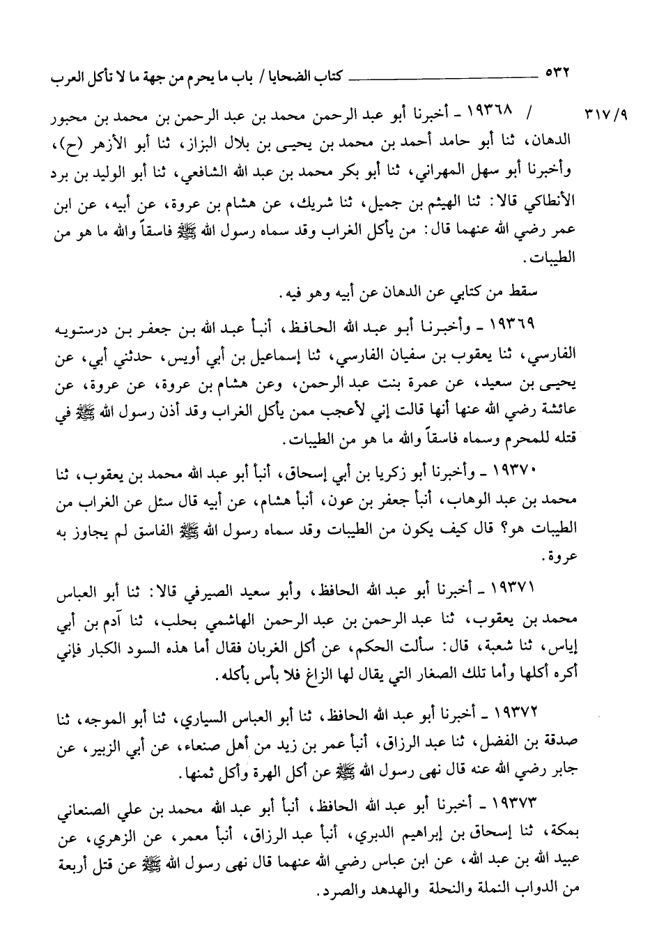 19368 - أَخْبَرَنَا أَبُو عَبْدِ الرَّحْمَنِ مُحَمَّدُ بْنُ عَبْدِ الرَّحْمَنِ بْنِ مُحَمَّدِ بْنِ مَحْبُورٍ الدَّهَّانُ , ثنا أَبُو حَامِدٍ أَحْمَدُ بْنُ مُحَمَّدِ بْنِ يَحْيَى بْنِ بِلَالٍ الْبَزَّازُ , ثنا أَبُو الْأَزْهَرِ، ح وَأَخْبَرَنَا أَبُو سَهْلٍ الْمَهْرَانِيُّ، ثنا أَبُو بَكْرٍ مُحَمَّدُ بْنُ عَبْدِ اللهِ الشَّافِعِيُّ , ثنا أَبُو الْوَلِيدِ بْنُ بُرْدٍ الْأَنْطَاكِيُّ، قَالَا: ثنا الْهَيْثَمُ بْنُ جَمِيلٍ، ثنا شَرِيكٌ، عَنْ هِشَامِ بْنِ عُرْوَةَ، عَنْ أَبِيهِ، عَنِ ابْنِ عُمَرَ رَضِيَ اللهُ عَنْهُمَا قَالَ: §مَنْ يَأْكُلُ الْغُرَابَ وَقَدْ سَمَّاهُ رَسُولُ اللهِ صَلَّى اللهُ عَلَيْهِ وَسَلَّمَ فَاسِقًا , وَاللهِ مَا هُوَ مِنَ الطَّيِّبَاتِ. سَقَطَ مِنْ كِتَابِي عَنِ الدَّهَّانِ عَنْ أَبِيهِ وَهُوَ فِيهِ