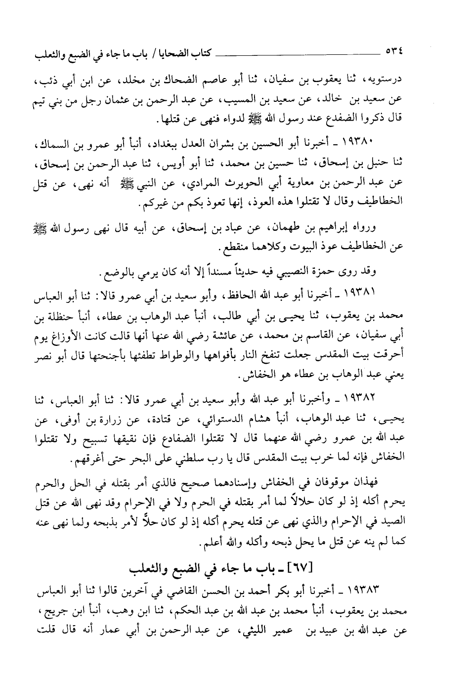 19382 - وَأَخْبَرَنَا أَبُو عَبْدِ اللهِ، وَأَبُو سَعِيدِ بْنُ أَبِي عَمْرٍو قَالَا: ثنا أَبُو الْعَبَّاسِ، ثنا يَحْيَى، ثنا عَبْدُ الْوَهَّابِ، أنبأ هِشَامٌ الدَّسْتُوَائِيُّ، عَنْ قَتَادَةَ، عَنْ زُرَارَةَ بْنِ أَوْفَى، عَنْ عَبْدِ اللهِ بْنِ عَمْرٍو رَضِيَ اللهُ عَنْهُمَا قَالَ: §لَا تَقْتُلُوا الضَّفَادِعَ فَإِنَّ نَقِيقَهَا تَسْبِيحٌ , وَلَا تَقْتُلُوا الْخُفَّاشَ فَإِنَّهُ لَمَّا خَرِبَ بَيْتُ الْمَقْدِسِ قَالَ: يَا رَبِّ سَلِّطْنِي عَلَى الْبَحْرِ حَتَّى أُغْرِقَهُمْ. فَهَذَانِ مَوْقُوفَانِ فِي الْخُفَّاشِ وَإِسْنَادُهُمَا صَحِيحٌ فَالَّذِي أَمَرَ بِقَتْلِهِ فِي الْحِلِّ وَالْحَرَمِ يَحْرُمُ أَكْلُهُ , إِذْ لَوْ كَانَ حَلَالًا لَمَا أَمَرَ بِقَتْلِهِ فِي الْحَرَمِ وَلَا فِي الْإِحْرَامِ , وَقَدْ نَهَى الله عَنْ قَتْلِ الصَّيْدِ فِي الْإِحْرَامِ , وَالَّذِي نَهَى عَنْ قَتْلِهِ يَحْرُمُ أَكْلُهُ إِذْ لَوْ كَانَ حَلَالًا أَمَرَ بِذَبْحِهِ وَلَمَا نَهَى عَنْهُ وَلَمَا نَهَى عَنْ قَتْلِهِ كَمَا لَمْ يَنْهَ عَنْ قَتْلِ مَا يَحِلُّ ذَبْحُهُ وَأَكْلُهُ , وَاللهُ أَعْلَمُ