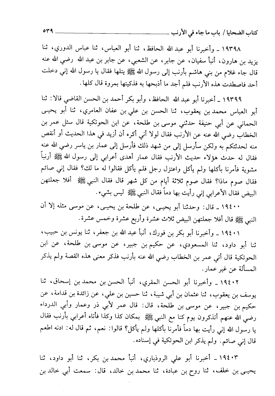 19399 - أَخْبَرَنَا أَبُو عَبْدِ اللهِ الْحَافِظُ، وَأَبُو بَكْرٍ أَحْمَدُ بْنُ الْحَسَنِ الْقَاضِي قَالَا: ثنا أَبُو الْعَبَّاسِ مُحَمَّدُ بْنُ يَعْقُوبَ , ثنا الْحَسَنُ بْنُ عَلِيِّ بْنِ عَفَّانَ الْعَامِرِيُّ، ثنا أَبُو يَحْيَى الْحِمَّانِيُّ، عَنْ أَبِي حَنِيفَةَ، حَدَّثَنِي مُوسَى بْنُ طَلْحَةَ، عَنِ ابْنِ الْحَوْتَكِيَّةِ، قَالَ: سُئِلَ عُمَرُ بْنُ الْخَطَّابِ رَضِيَ اللهُ عَنْهُ عَنِ الْأَرْنَبِ، فَقَالَ: لَوْلَا أَنِّي أَكْرَهُ أَنْ أَزِيدَ فِي هَذَا الْحَدِيثِ أَوْ أَنْقُصَ مِنْهُ لَحَدَّثْتُكُمْ بِهِ , وَلَكِنْ سَأُرْسِلُ إِلَى مَنْ شَهِدَ ذَلِكَ. فَأَرْسَلَ إِلَى عَمَّارِ بْنِ يَاسِرٍ رَضِيَ اللهُ عَنْهُ فَقَالَ لَهُ: حَدِّثْ هَؤُلَاءِ حَدِيثَ الْأَرْنَبِ. فَقَالَ عَمَّارٌ: §أَهْدَى أَعْرَابِيٌّ إِلَى رَسُولِ اللهِ صَلَّى اللهُ عَلَيْهِ وَسَلَّمَ أَرْنَبًا مَشْوِيَّةً فَأَمَرَنَا بِأَكْلِهَا وَلَمْ يَأْكُلْ , وَاعْتَزَلَ رَجُلٌ فَلَمْ يَأْكُلْ , فَقَالُوا لَهُ: مَا لَكَ؟ فَقَالَ: إِنِّي صَائِمٌ. فَقَالَ: صَوْمُ مَاذَا؟ فَقَالَ: صَوْمُ ثَلَاثَةِ أَيَّامٍ مِنْ كُلِّ شَهْرٍ. قَالَ: فَقَالَ النَّبِيُّ صَلَّى اللهُ عَلَيْهِ وَسَلَّمَ: " أَفَلَا جَعَلْتَهُنَّ الْبِيضَ "؟ فَقَالَ الْأَعْرَابِيُّ: إِنِّي رَأَيْتُ بِهَا دَمًا. فَقَالَ النَّبِيُّ صَلَّى اللهُ عَلَيْهِ وَسَلَّمَ: " لَيْسَ بِشَيْءٍ ".