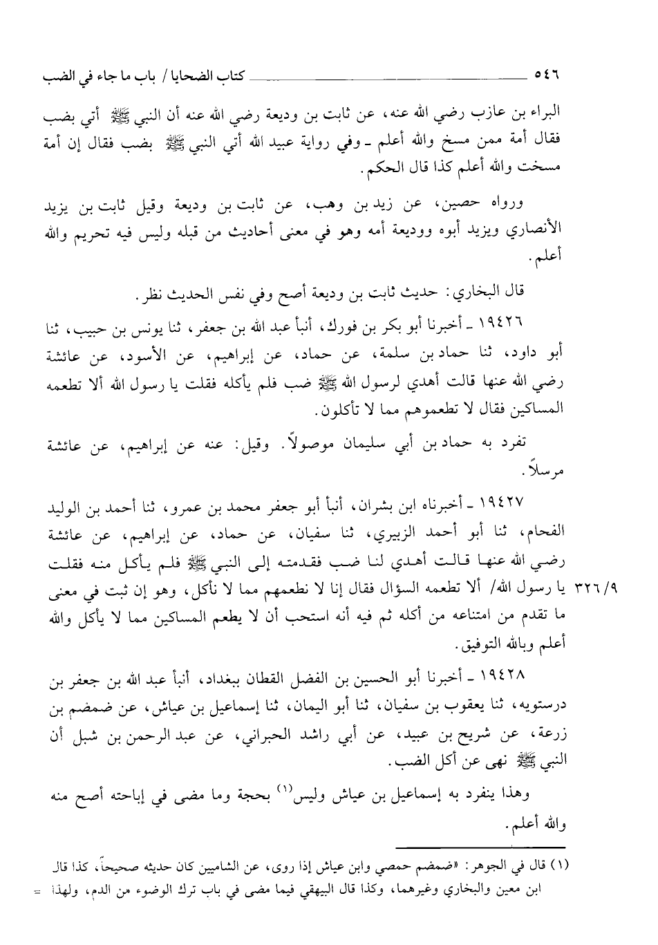 19428 - أَخْبَرَنَا أَبُو الْحُسَيْنِ بْنُ الْفَضْلِ الْقَطَّانُ بِبَغْدَادَ , أنبأ عَبْدُ اللهِ بْنُ جَعْفَرِ بْنِ دَرَسْتَوَيْهِ، ثنا يَعْقُوبُ بْنُ سُفْيَانَ، ثنا أَبُو الْيَمَانِ، ثنا إِسْمَاعِيلُ بْنُ عَيَّاشٍ، عَنْ ضَمْضَمِ بْنِ زُرْعَةَ، عَنْ شُرَيْحِ بْنِ عُبَيْدٍ، عَنْ أَبِي رَاشِدٍ الْحُبْرَانِيِّ، عَنْ عَبْدِ الرَّحْمَنِ بْنِ شِبْلٍ، أَنَّ النَّبِيَّ صَلَّى اللهُ عَلَيْهِ وَسَلَّمَ §نَهَى عَنْ أَكْلِ الضَّبِّ. وَهَذَا يَنْفَرِدُ بِهِ إِسْمَاعِيلُ بْنُ عَيَّاشٍ وَلَيْسَ بِحُجَّةٍ , وَمَا مَضَى فِي إِبَاحَتِهِ أَصَحُّ مِنْهُ , وَاللهُ أَعْلَمُ