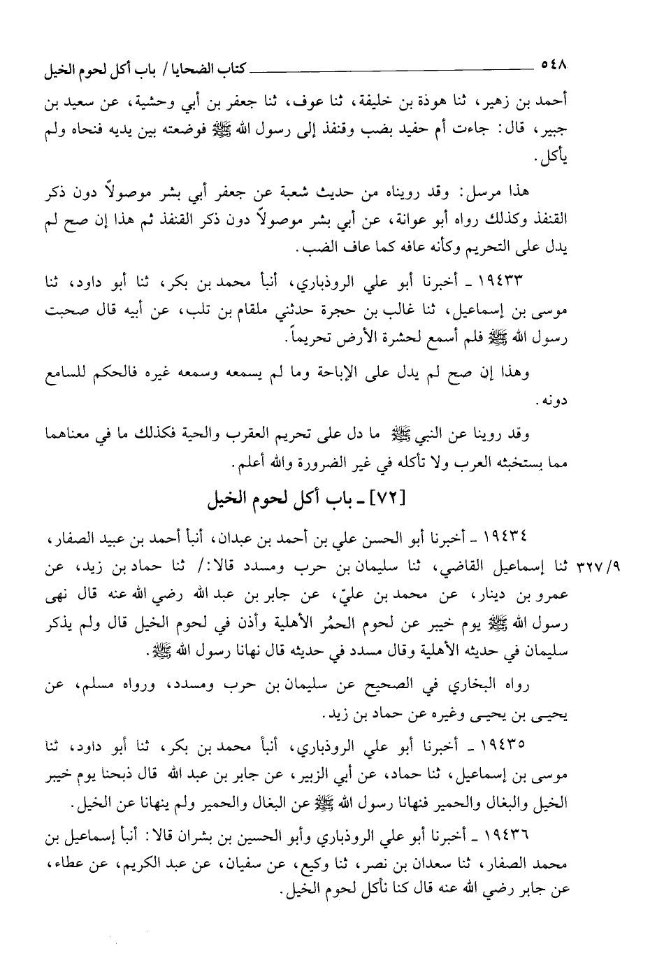 19435 - أَخْبَرَنَا أَبُو عَلِيٍّ الرُّوذْبَارِيُّ، أنبأ مُحَمَّدُ بْنُ بَكْرٍ، ثنا أَبُو دَاوُدَ، ثنا مُوسَى بْنُ إِسْمَاعِيلَ، ثنا حَمَّادٌ، عَنْ أَبِي الزُّبَيْرِ، عَنْ جَابِرِ بْنِ عَبْدِ اللهِ، قَالَ: ذَبَحْنَا يَوْمَ خَيْبَرَ الْخَيْلَ وَالْبِغَالَ وَالْحَمِيرَ , §فَنَهَانَا رَسُولُ اللهِ صَلَّى اللهُ عَلَيْهِ وَسَلَّمَ عَنِ الْبِغَالِ وَالْحَمِيرِ وَلَمْ يَنْهَنَا عَنِ الْخَيْلِ